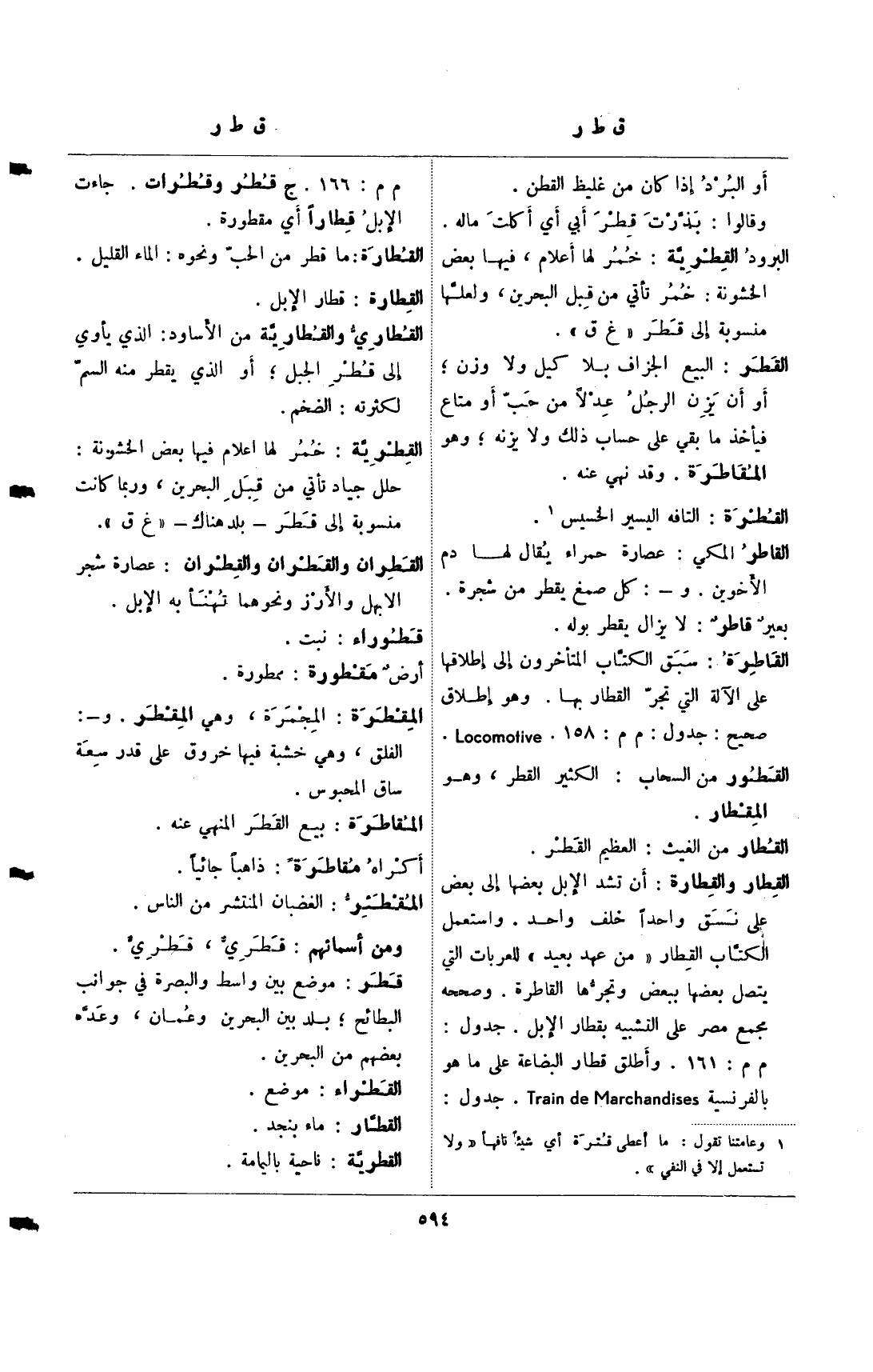 القطار والقطارة: أن تشد الإبل بعضها إلى بعض على نسق واحدا خلف واحد. واستعمل الكتاب القطار "من عهد بعيد" للعربات التي يتصل بعضها ببعض وتجرها القاطرة. وصححه مجمع مصر على التشبيه بقطار الإبل. جدول: م م: 161. وأطلق قطار البضاعة على ما هو بالفرنسية train de marchandises. جدول: م م: 166. ج قطر وقطرات. جاءت الإبل قطارا أي مقطورة.