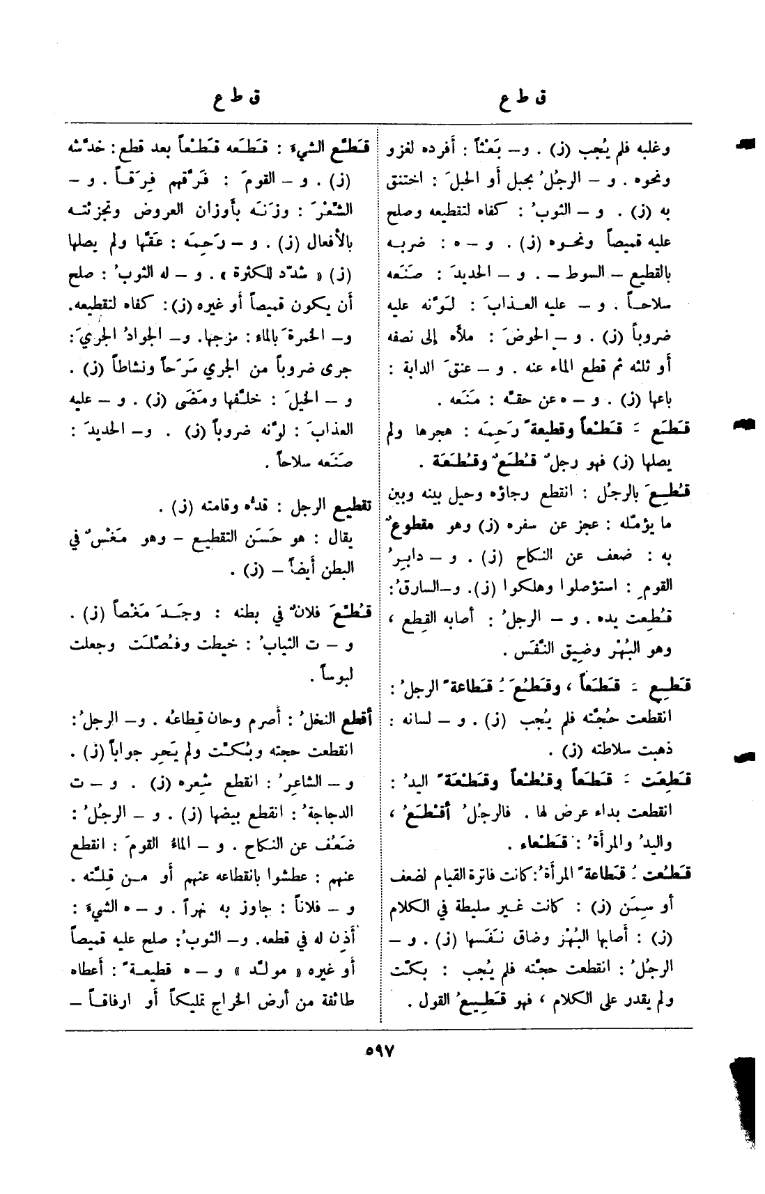 وغلبه فلم يجب (ز). و- بعثا: أفرده لغزو ونحوه. و- الرجل بحبل أو الحبل: اختنق هـ (ز). و- الثوب: كفاه لتقطيعه وصلح عليه قميصا ونحوه (ز). و- هـ: ضربه بالقطيع- السوط-. و- الحديد: صنعه سلاحا. و- عليه العذاب: لونه عليه ضروبا (ز). و- الحوض: ملأه إلى نصفه أو ثلثه ثم قطع الماء عنه. و- عنق الدابة: باعها (ز). و- هـ عن حقه: منعه.