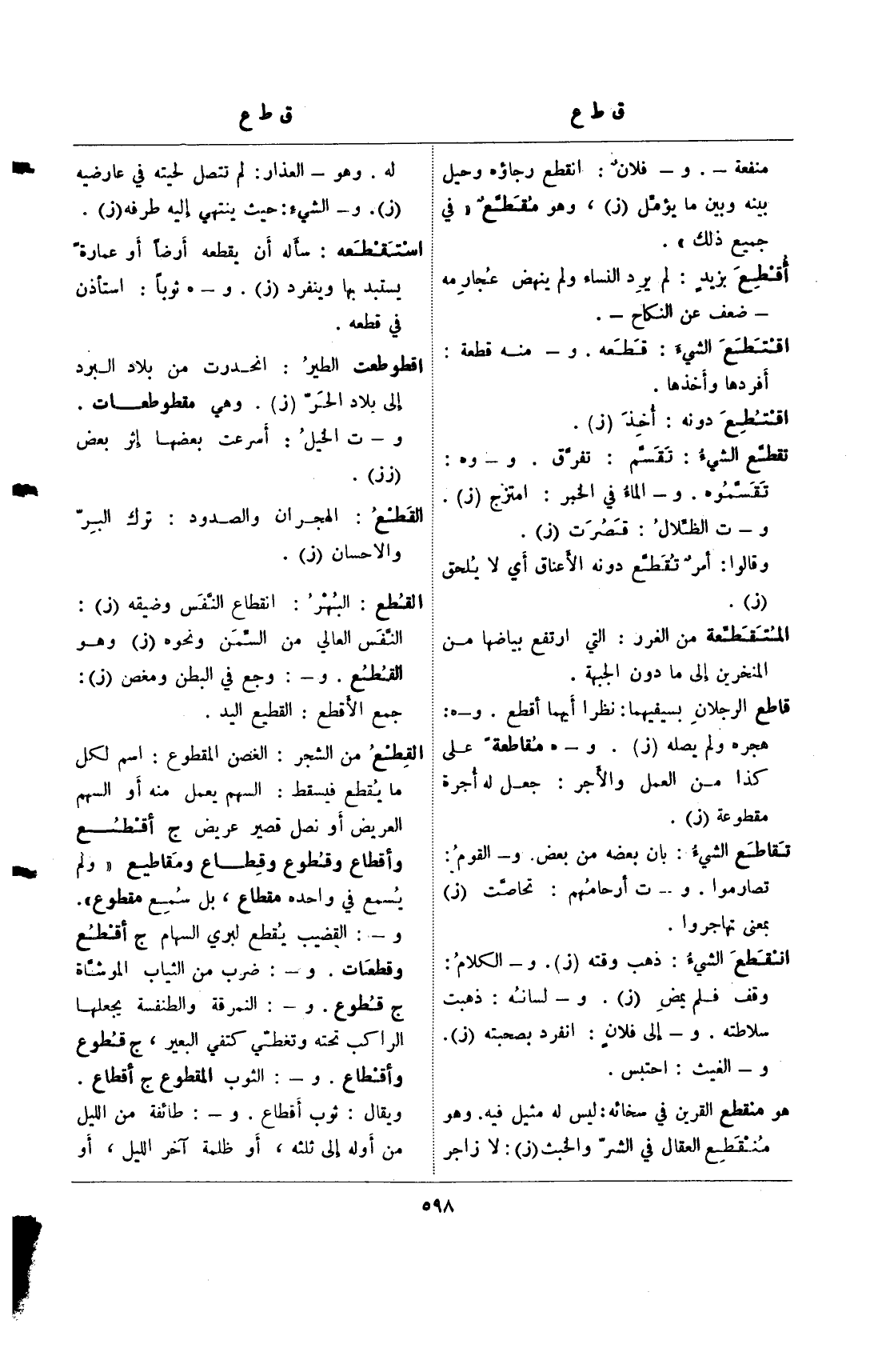 القطع: البهر: انقطاع النفس وضيقه (ز): النفس العالي من السمن ونحوه (ز) وهو القطع. و-: وجع في البطن ومغص (ز): جمع الأقطع: القطيع اليد.