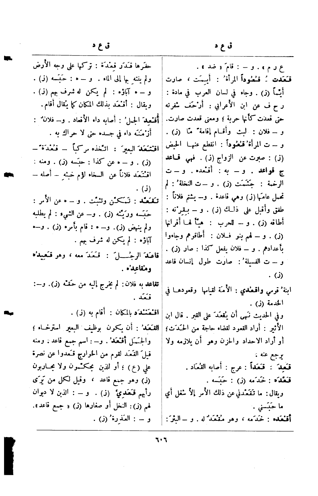 قعدت- قعودا المرأة: أيمت، صارت أيما (ز). وجاء في لسان العرب في مادة: ر ح ف عن ابن الأعرابي: أرحف شفرته حتى قعدت كأنها حربة؛ ومعنى قعدت صارت. و- فلان: لبث وأقام إقامة ما (ز). و- ت المرأة قعودا: انقطع عنها الحيض (ز): صبرت عن الزواج (ز). فهي قاعد ج قواعد. و- به: أقعده. و- ت الرخمة: جثمت (ز). و- ت النخلة: لم تحمل عامها (ز) وهي قاعدة. و- يشتم فلانا: طفق وأقبل على ذلك (ز). و- بقرنه: أطاقه (ز). و- للحرب: هيأ لها أقرانها (ز). و- لهم بنو فلان: أطاقوهم وجاءوا بأعدادهم. و- فلان يفعل كذا: صار (ز). و- ت الفسيلة: صارت طول إنسان قاعد (ز).