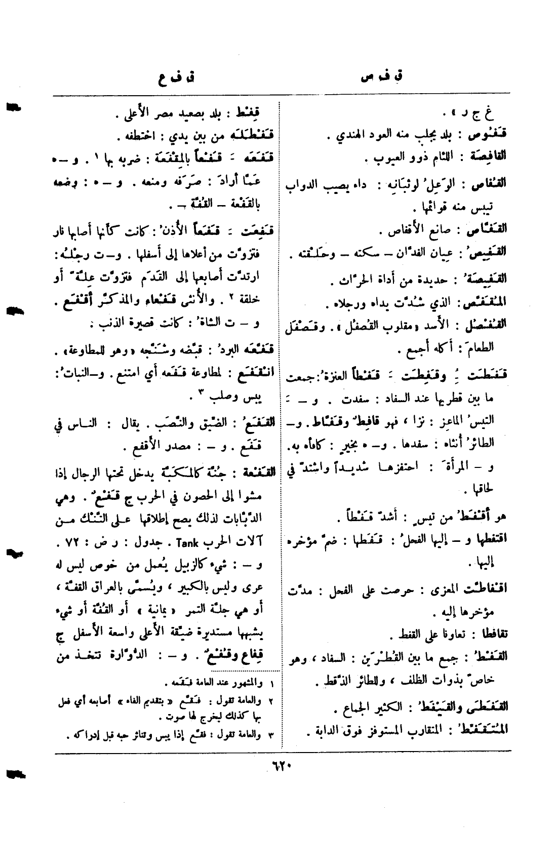 القفعة: جنة كالمكبة يدخل تحتها الرجال إذا مشوا إلى الحصون في الحرب ج قفع. وهي الدبابات لذلك يصح إطلاقها على التنك من آلات الحرب tank. جدول: ر ض: 72. و-: شيء كالزبيل يعمل من خوص ليس له عرى وليس بالكبير، ويسمى بالعراق القفة، أو هي جلة التمر "يمانية" أو القفة أو شيء يشبهها مستديرة ضيقة الأعلى واسعة الأسفل ج قفاع وقفع. و-: الدوارى تتخذ من