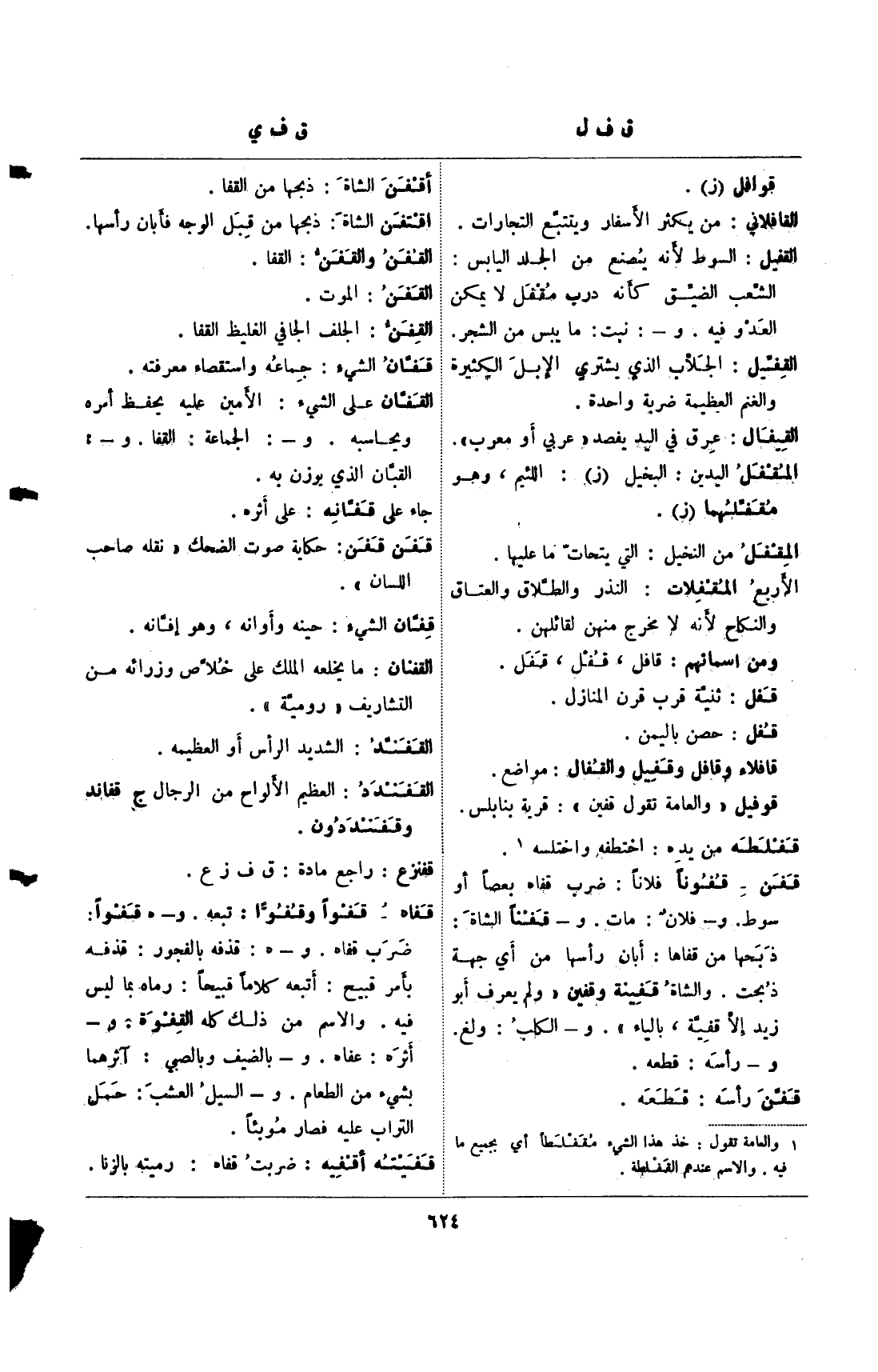 قفن- قفونا فلانا: ضرب قفاه بعصا أو سوط. و- فلان: مات. و- قفنا الشاة: ذبحها من قفاها: أبان رأسها من أي جهة ذبحت. والشاة قفينة وقفين "ولم يعرف أبو زيد إلا قفية، بالياء". و- الكلب: ولغ. و- رأسه: قطعه.