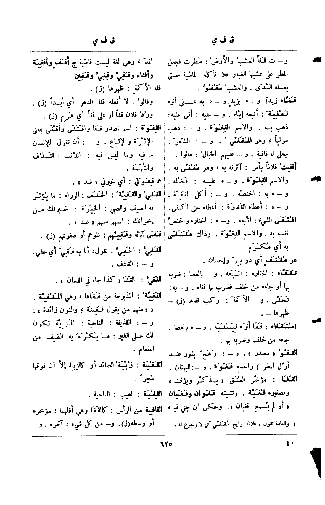 القفية: المذبوحة من قفاها، هي المقفية. "ومنهم من يقول قفينة؛ والنون زائدة". و-: القذيفة: الناحية: المزية تكون لك على الغير: ما يكرم به الضيف من الطعام.