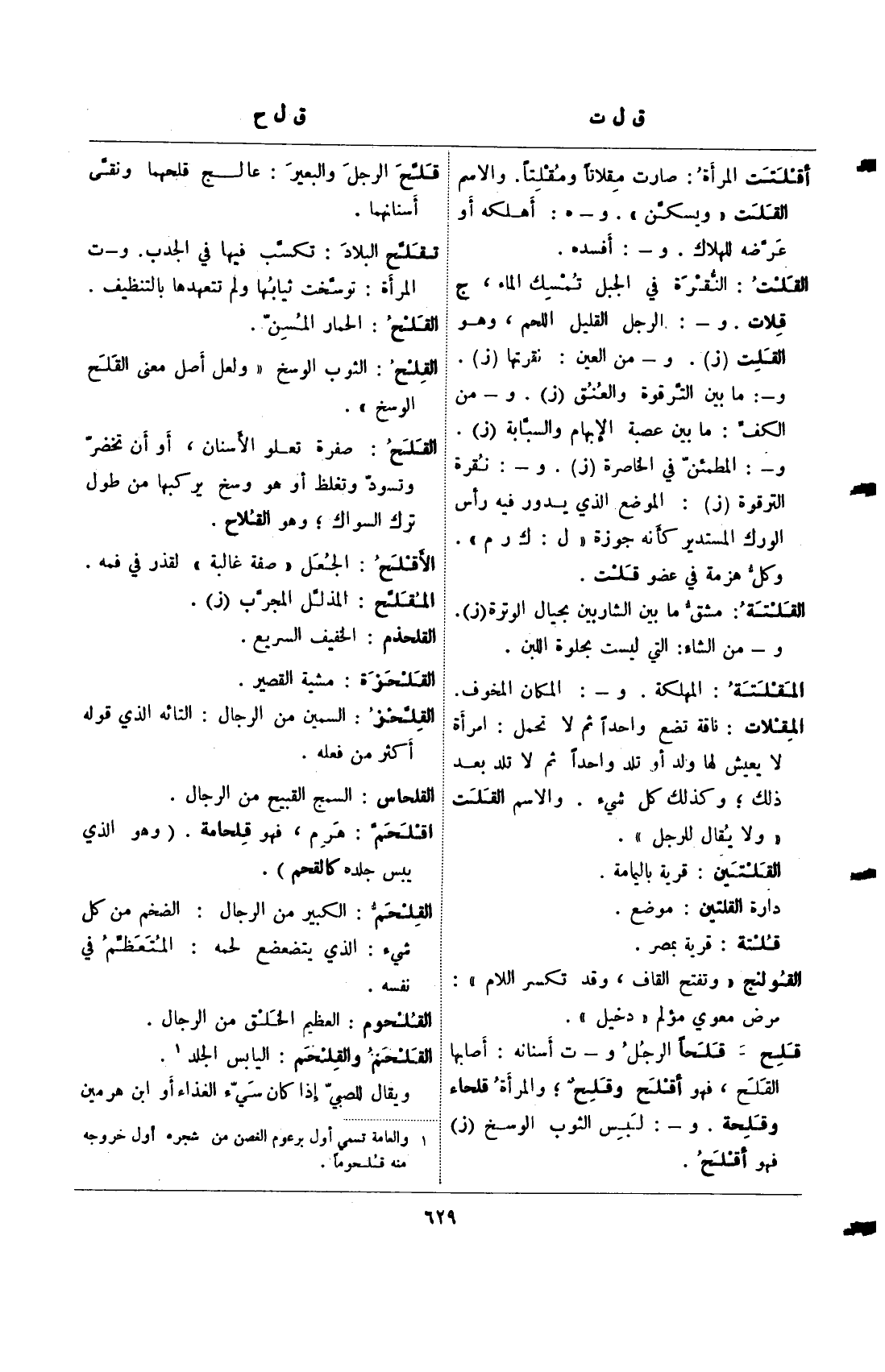القلت: النقرة في الجبل تمسك الماء، ج قلات. و-: الرجل القليل اللحم، وهو القلت (ز). و- من العين: نقرتها (ز). و-: ما بين الترقوة والعنق (ز). و- من الكف: ما بين عصبة الإبهام والسبابة (ز). و-: المطمئن في الخاصرة (ز). و-: نقرة الترقوة (ز): الموضع الذي يدور فيه رأس الورك المستدير كأنه جوزة "ل: ك ر م". وكل هزمة في عضو قلت.