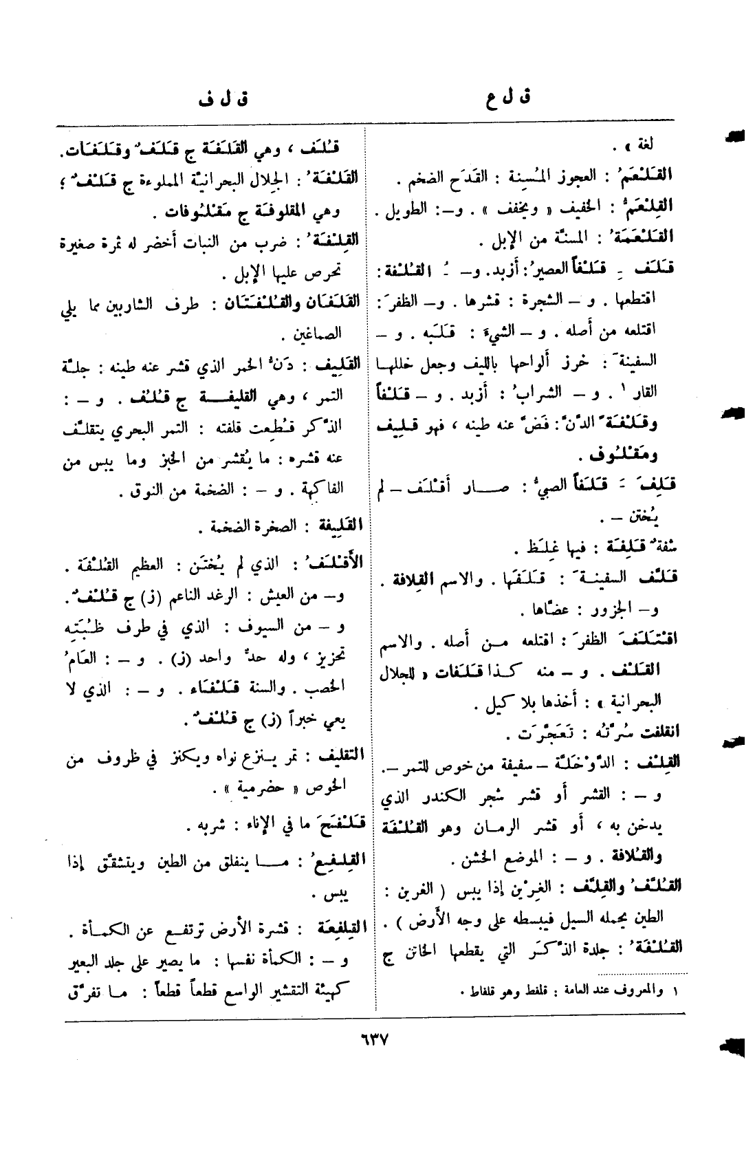 قلف- قلفا العصير: أزبد. و- القلفة: اقتطعها. و- الشجرة: قشرها. و- الظفر: اقتلعه من أصله. و- الشيء: قلبه. و- السفينة: خرز ألواحها بالليف وجعل خللها القار (¬1). و- الشراب: أزبد. و- قلفا وقلفة الدن: فض عنه طينه، فهو قليف ومقلوف.