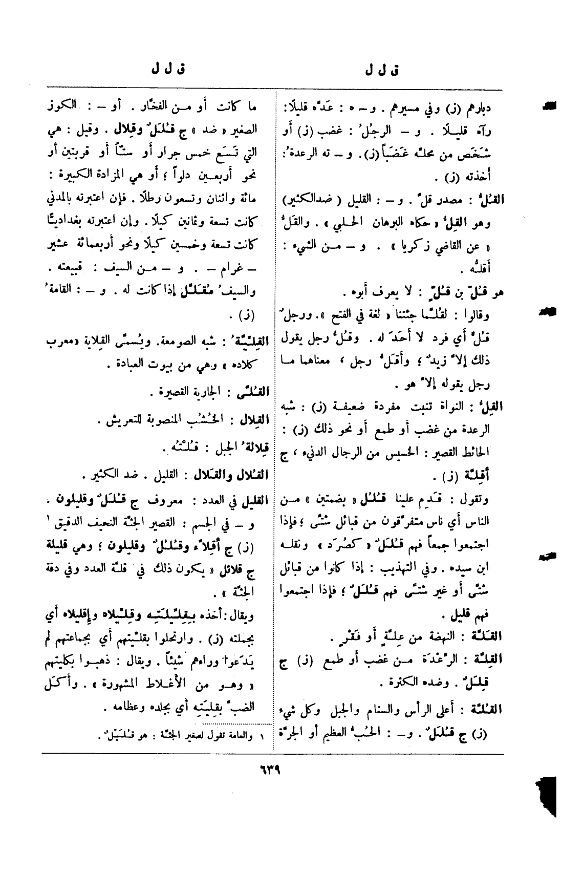 القلة: أعلى الرأس والسنام والجبل وكل شيء (ز) ج قلل. و-: الحب العظيم أو الجرة ما كانت أو من الفخار. أو-: الكوز الصغير "ضد" ج قلل وقلال. وقيل: هي التي تسع خمس جرار أو ستا أو قربتين أو نحو أربعين دلوا؛ أو هي المزادة الكبيرة: مائة واثنان وتسعون رطلا. فإن اعتبرته بالمدني كانت تسعة وثمانين كيلا. وإن اعتبرته بغداديا كانت تسعة وخمسين كيلا ونحو أربعمائة عشير- غرام-. و- من السيف: قبيعته. والسيف مقلل إذا كانت له. و-: القامة (ز).