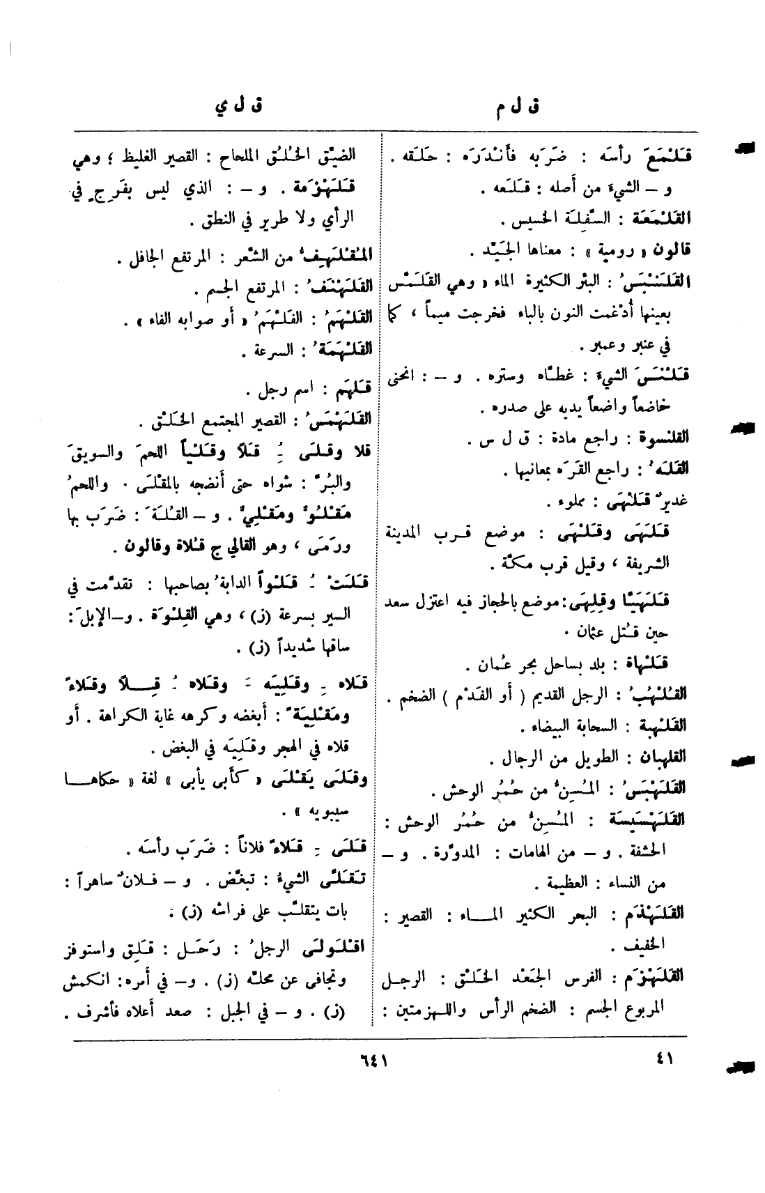 القلهزم: الفرس الجعد الخلق: الرجل المربوع الجسم: الضخم الرأس واللهزمتين: الضيق الخلق الملحاح: القصير الغليظ؛ وهي قلهزمة. و-: الذي ليس بفرج في الرأي ولا طرير في النطق.