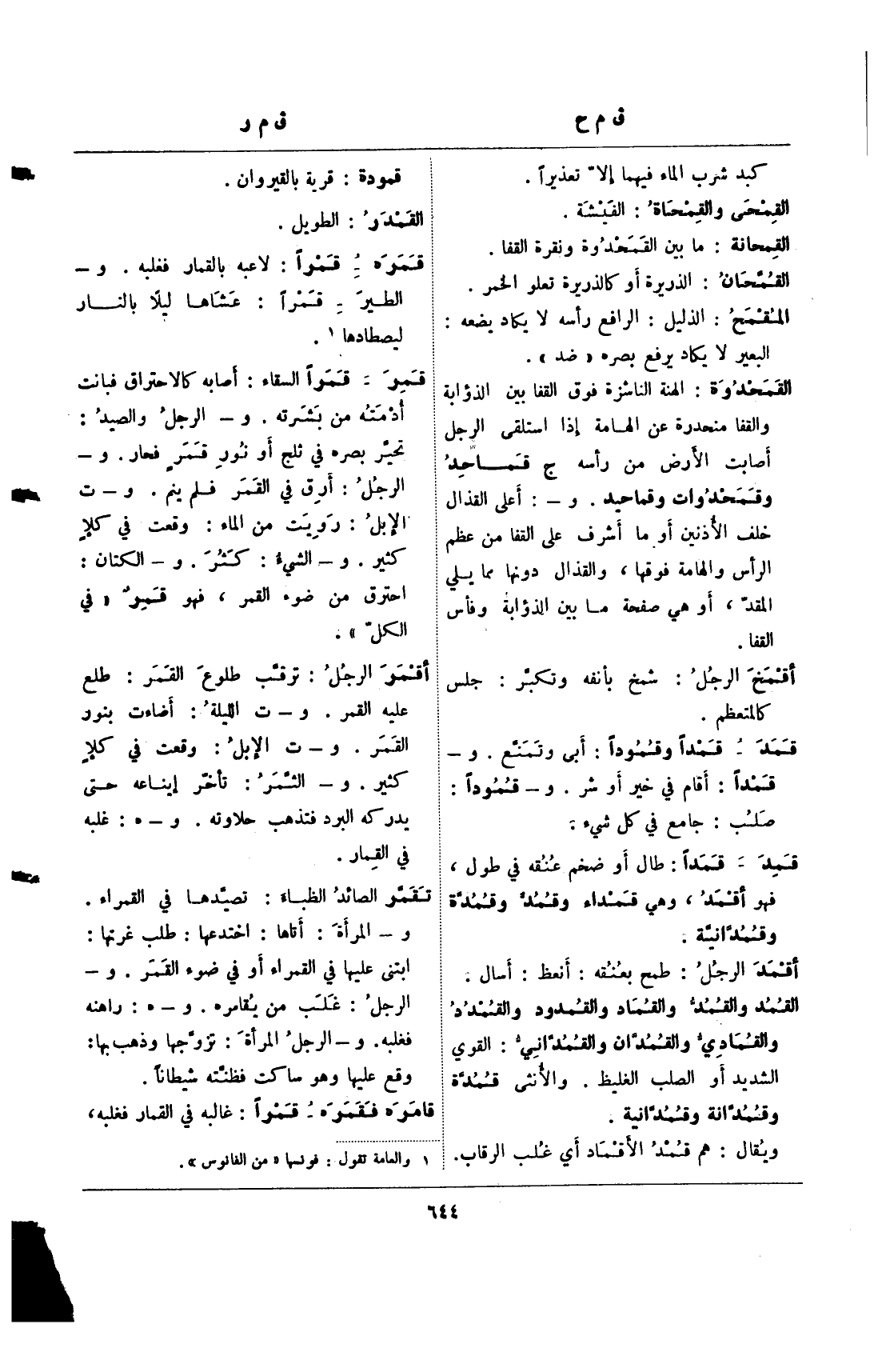 قمد- قمدا وقمودا: أبى وتمنع. و- قمدا: أقام في خير أو شر. و- قمودا: صلب: جامع في كل شيء.