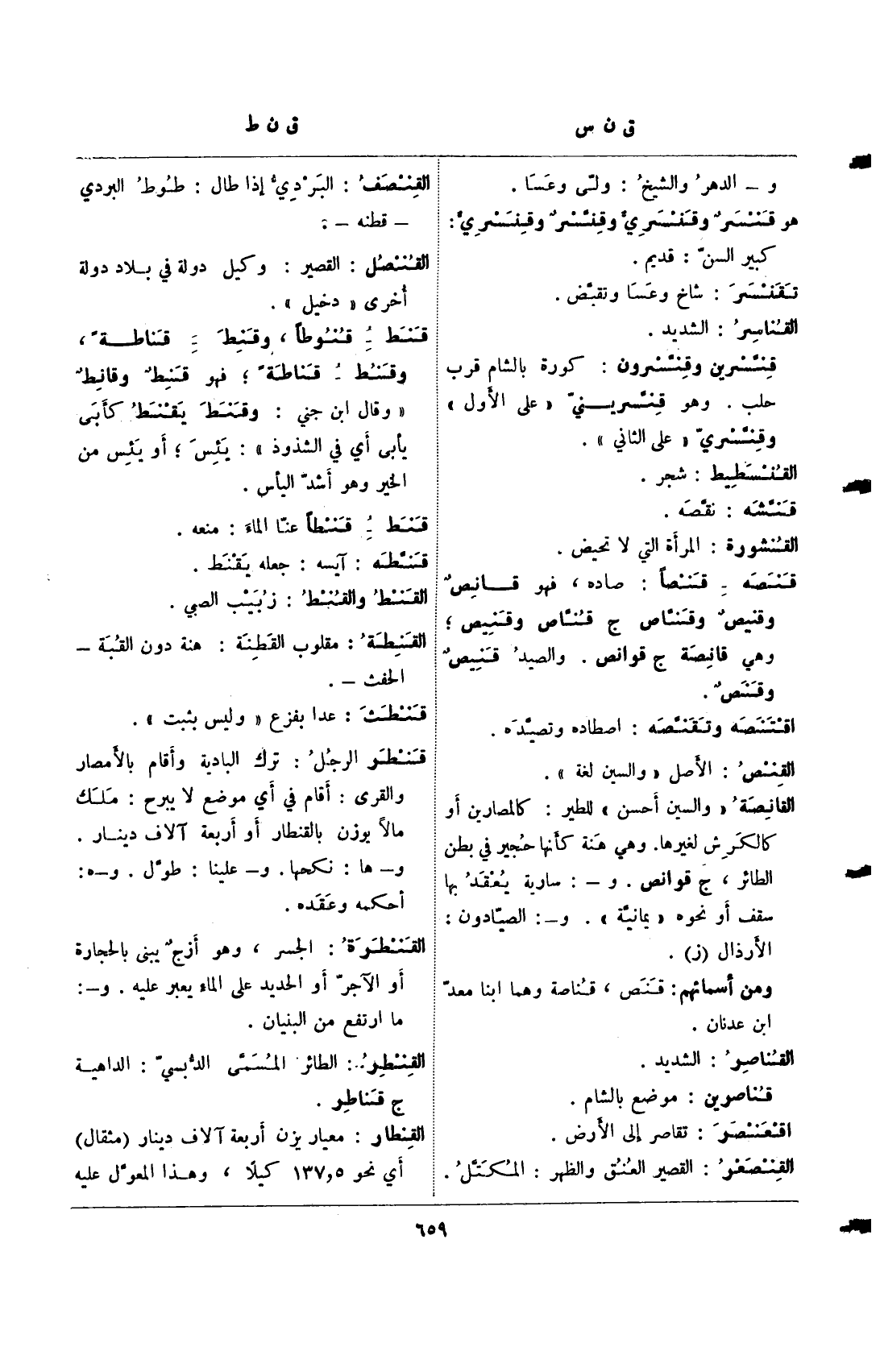 قنطر الرجل: ترك البادية وأقام بالأمصار والقرى: أقام في أي موضع لا يبرح: ملك مالا يوزن بالقنطار أو أربعة آلاف دينار. و- ها: نكحها. و- علينا: طول. و- هـ: أحكمه وعقده.
