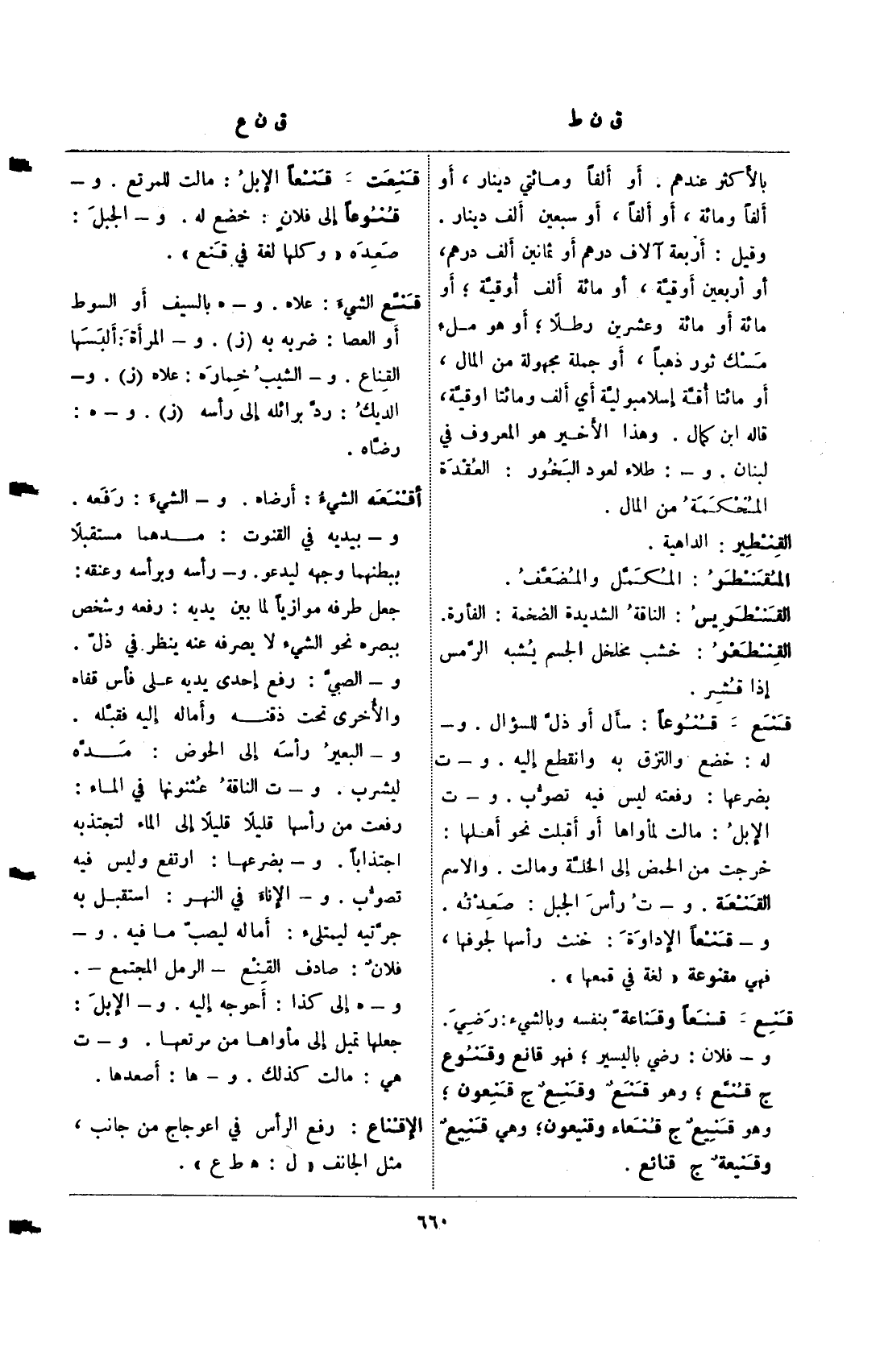 قنع- قنوعا: سأل أو ذل للسؤال. و- له: خضع والتزق به وانقطع إليه. و- ت بضرعها: رفعته ليس فيه تصوب. و- ت الإبل: مالت لمأواها أو أقبلت نحو أهلها: خرجت من الحمض إلى الخلة ومالت. والاسم القنعة. و- ت رأس الجبل: صعدته. و- قنعا الإداوة: خنث رأسها لجوفها، فهي مقنوعة "لغة في قمعها".