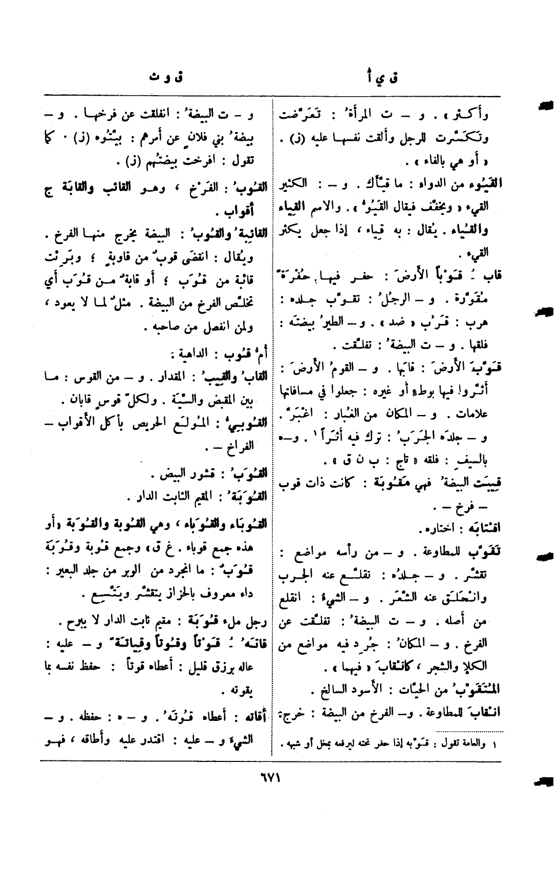 قاب- قوبا الأرض: حفر فيها حفرة مقورة. و- الرجل: تقوب جلده: هرب: قرب "ضد". و- الطي بيضته: فلقها. و- ت البيضة: تفلقت.