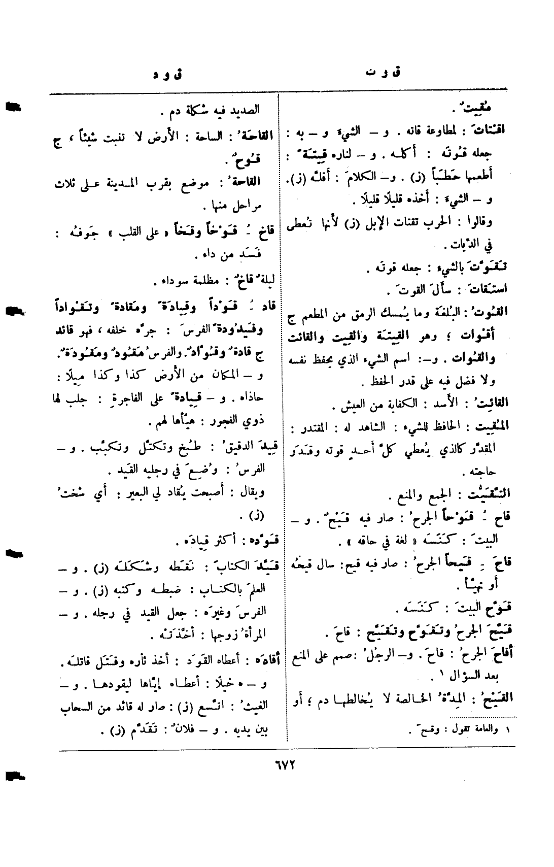 قاد- قودا وقيادة ومقادة وتقوادا وقيدودة الفرس: جره خلفه، فهو قائد ج قادة وقواد. والفرس مقود ومقودة. و- المكان من الأرض كذا وكذا ميلا: حاذاه. و- قيادة على الفاجرة: جلب لها ذوي الفجور: هيأها لهم.