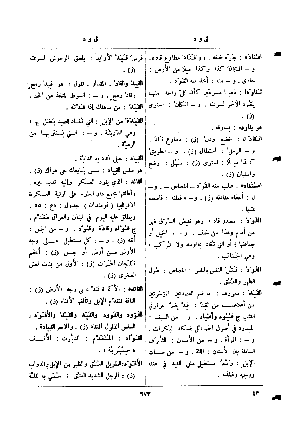 القود: مصدر قاد، وهو نقيض السوق فهو من أمام وهذا من خلف. و-: الخيل أو جماعتها؛ أو التي تقاد مقاودها ولا تركب، وهي الجنائب.