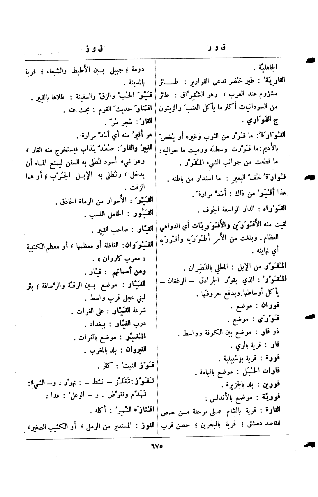 القارية: طير خضر تدعى القوارير: طائر مشؤوم عند العرب، وهو الشقراق: طائر من السودانيات أكثر ما يأكل العنب والزيتون ج القواري.