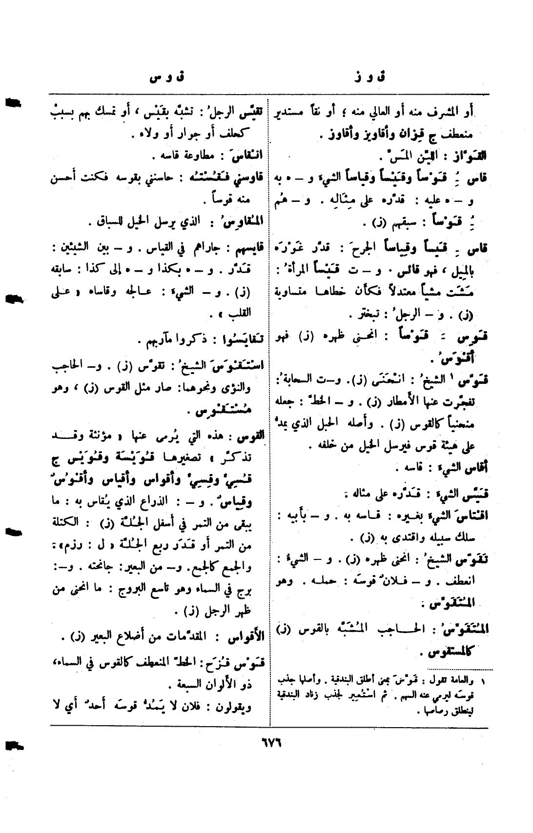 القوس: هذه التي يرمى عنها "مؤنثة وقد تذكر" تصغيرها قويسة وقويس ج قسي وقسي وأقواس وأقياس وأقوس وقياس. و-: الذراع الذي يقاس به: ما يبقى من التمر في أسفل الجلة (ز): الكتلة من التمر أو قدر ربع الجلة "ل: ر ز م". والجمع كالجمع. و- من البعير: جانحته. و-: برج في السماء وهو تاسع البروج: ما انحنى من ظهر الرجل (ز).
