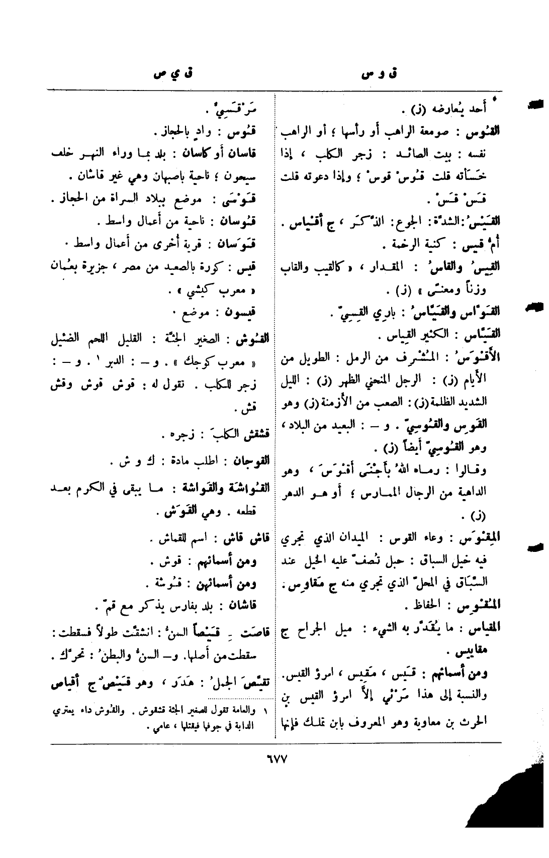 الأقوس: المشرف من الرمل: الطويل من الأيام (ز): الرجل المنحني الظهر (ز): الليل الشديد الظلمة (ز): الصعب من الأزمنة (ز) وهو القوس والقوسي. و-: البعيد من البلاد، وهو القوسي أيضا (ز).
