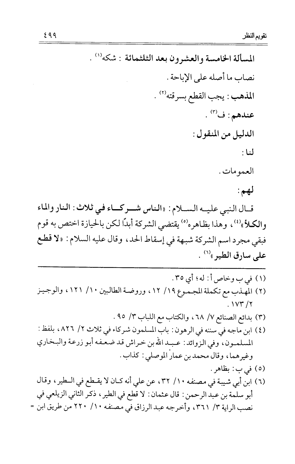 قَالَ النَّبِي عَلَيْهِ السَّلَام: " النَّاس شُرَكَاء فِي ثَلَاث: النَّار وَالْمَاء والكلأ، وَهَذَا بِظَاهِرِهِ يَقْتَضِي الشّركَة أبدا لَكِن بالحيازة اخْتصَّ بِهِ قوم فَبَقيَ مُجَرّد اسْم الشّركَة شُبْهَة فِي إِسْقَاط الْحَد، وَقَالَ عَلَيْهِ السَّلَام: لَا قطع على سَارِق الطير.
