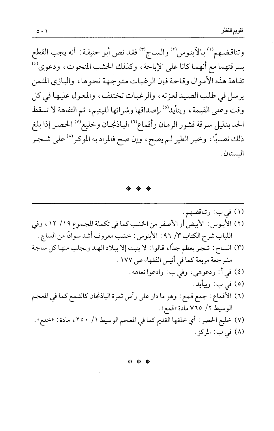 وتناقضهم بالآبنوس والساج فقد نَص أَو حنيفَة: أَنه يجب الْقطع بسرقتهما مَعَ أَنَّهُمَا كَانَا على الْإِبَاحَة، وَكَذَلِكَ الْخشب المنحوت، وَدَعوى تفاهة هَذِه الْأَمْوَال وقاحة فَإِن الرغبات متوجهة نَحْوهَا، والبازي الْمُثمن يُرْسل فِي طلب الصَّيْد لعزته، والرغبات تخْتَلف، والمعول عَلَيْهَا فِي كل وَقت وعَلى الْقيمَة، ويتأيد بإصداقها وشرائها للْيَتِيم، ثمَّ التفاهة لَا تسْقط الْحَد بِدَلِيل سَرقَة قشور الرُّمَّان وأقماع الباذنجان وخليع الْحصْر إِذا بلغ ذَلِك نِصَابا، وَخبر الطير لم يَصح، وَإِن صَحَّ فَالْمُرَاد بِهِ الموكر على شجر الْبُسْتَان.