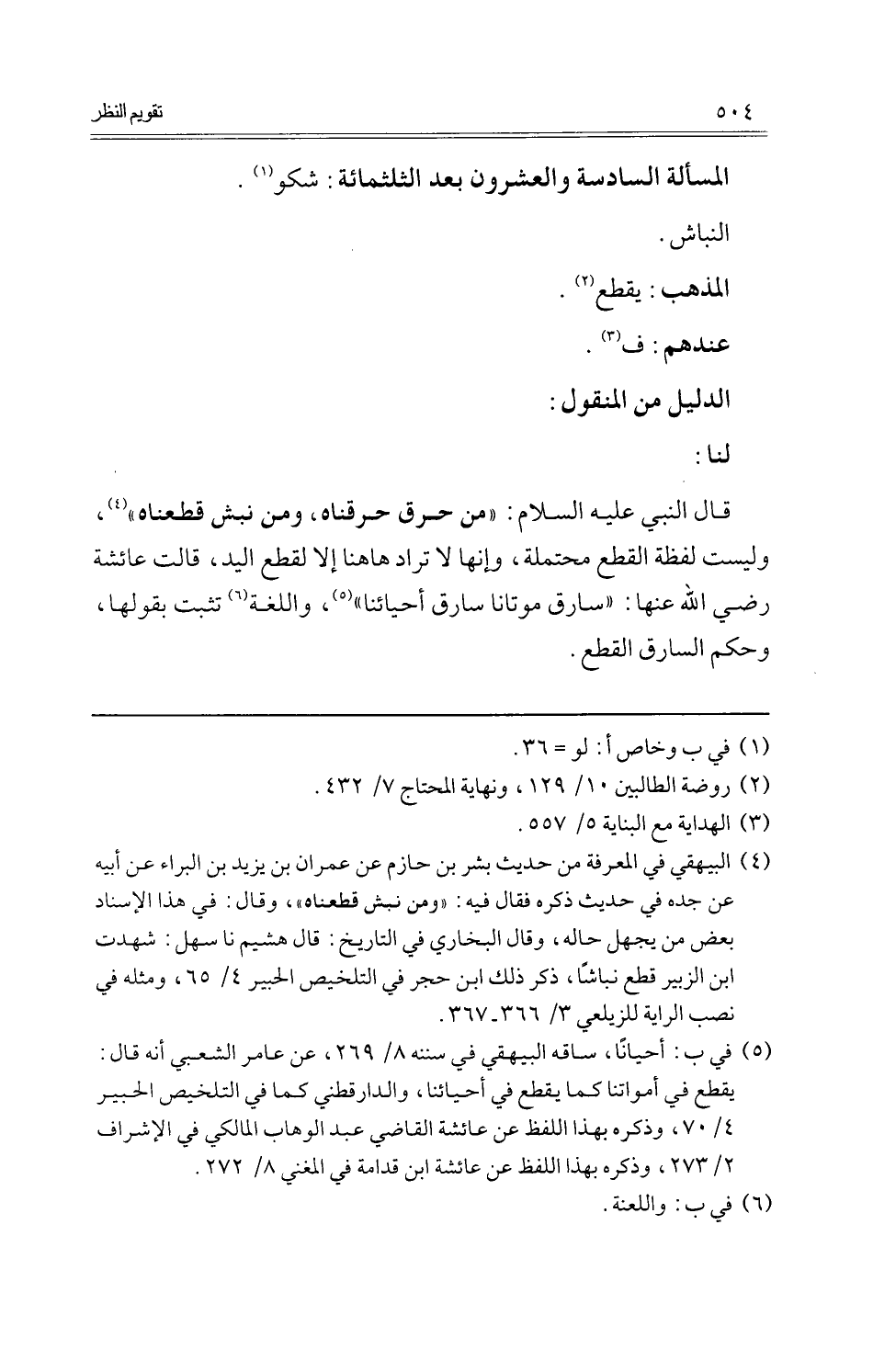 قَالَ البني عَلَيْهِ السَّلَام: " من حرق حرقناه، وَمن نبش قطعناه "، وَلَيْسَت لَفْظَة الْقطع مُحْتَملَة، وَإِنَّهَا لَا ترَاد هَاهُنَا إِلَّا لقطع الْيَد، قَالَت عَائِشَة رَضِي اللَّهِ عَنْهَا: " سَارِق مَوتَانا سَارِق أحيائنا "، واللغة تثبت بقولِهَا وَحكم السَّارِق الْقطع.