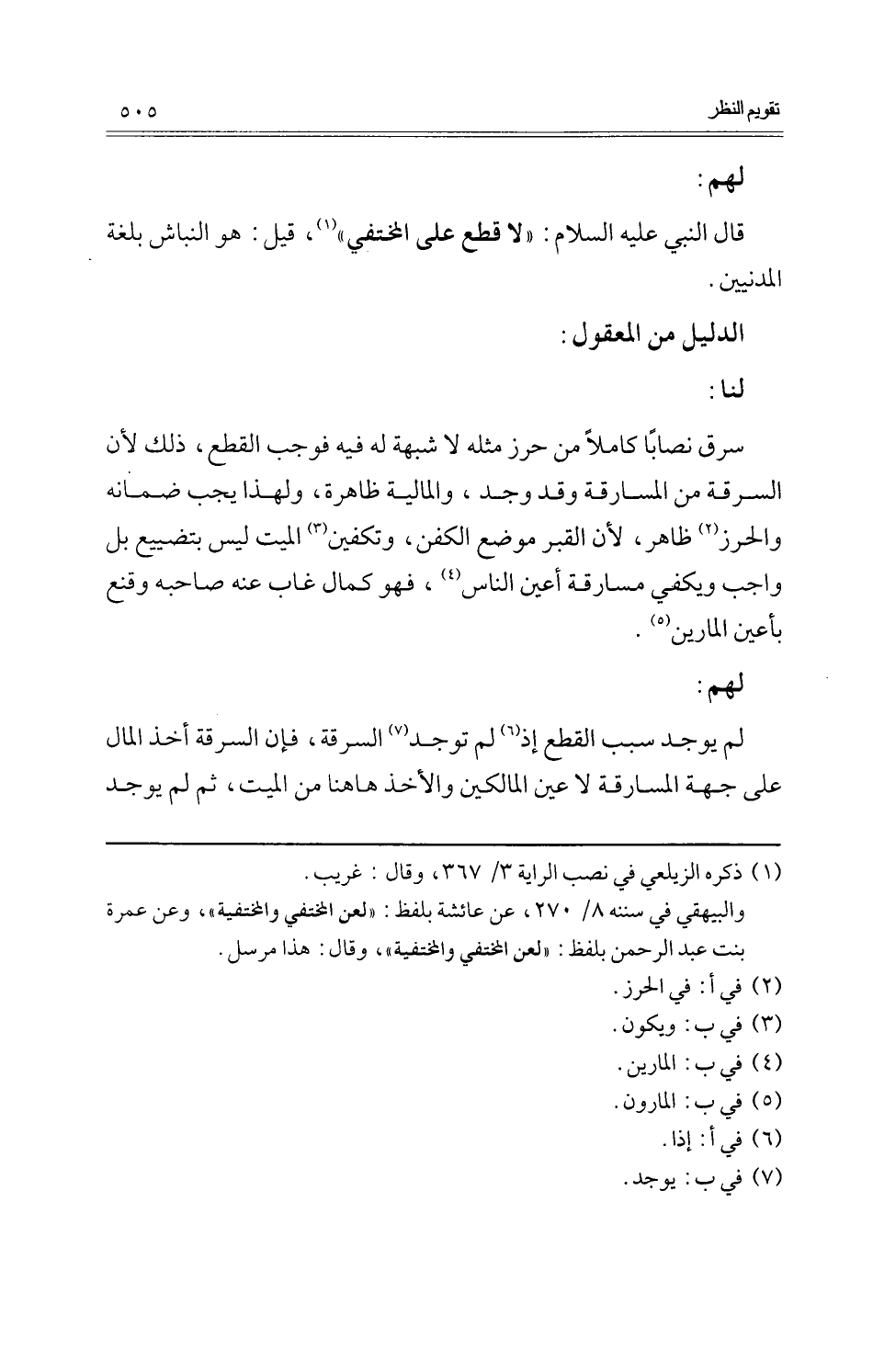 سرق نِصَابا كَامِلا من حرز مثله لَا شُبْهَة لَهُ فِيهِ فَوَجَبَ الْقطع، ذَلِك لِأَن السّرقَة من المسارقة وَقد وجد، والمالية ظَاهِرَة، وَلِهَذَا يجب ضَمَانه والحرز ظَاهر، لِأَن الْقَبْر مَوضِع الْكَفَن، وتكفين الْمَيِّت لَيْسَ بتضييع بل وَاجِب وَيَكْفِي مسارقة أعين النَّاس، فَهُوَ كَمَال غَابَ عَنهُ صَاحبه وقنع بأعين المارين.