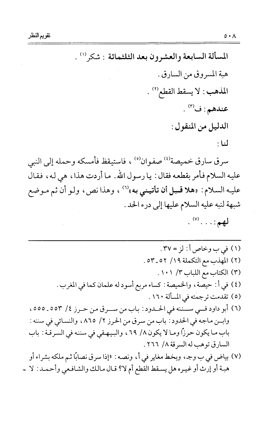 سرق سَارِق خميصة صَفْوَان، فَاسْتَيْقَظَ فأمسكه وَحمله إِلَى النَّبِي عَلَيْهِ السَّلَام فَأمر بِقطعِهِ فَقَالَ: يَا رَسُول اللَّهِ. مَا أردْت هَذَا، هِيَ لَهُ، فَقَالَ عَلَيْهِ السَّلَام: " هلا قبل أَن تَأتِينِي بِهِ "، وَهَذَا نَص، وَلَو أَن ثمَّ مَوضِع شُبْهَة لنبه عَلَيْهِ السَّلَام عَلَيْهَا إِلَى دَرْء الْحَد.