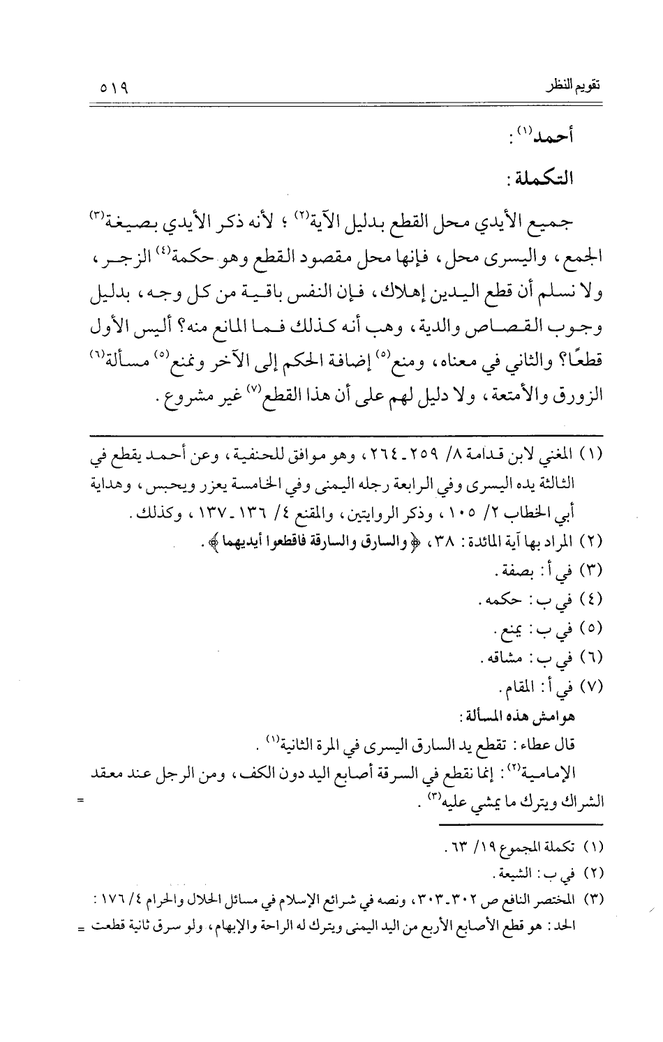 جَمِيع الْأَيْدِي مَحل الْقطع بِدَلِيل الْآيَة؛ لِأَنَّهُ ذكر الْأَيْدِي بِصِيغَة الْجمع، واليسرى مَحل، فَإِنَّهَا مَحل مَقْصُود الْقطع وَهُوَ حِكْمَة الزّجر، وَلَا نسلم أَن قطع الْيَدَيْنِ إهلاك، فَإِن النَّفس بَاقِيَة من كل وَجه، بِدَلِيل وجوب الْقصاص وَالدية، وهب أَنه كَذَلِك فَمَا الْمَانِع مِنْهُ؟ أَلَيْسَ الأول قطعا؟ وَالثَّانِي فِي مَعْنَاهُ، وَمنع إِضَافَة الحكم إِلَى الآخر ونمنع مَسْأَلَة الزورق والأمتعة، وَلَا دَلِيل لَهُم على أَن هَذَا الْقطع غير مَشْرُوع.