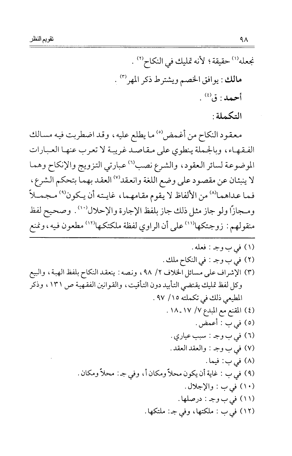 مَعْقُود النِّكَاح من أغمض مَا يطلع عَلَيْهِ، وَقد اضْطَرَبَتْ فِيهِ مسالك الْفُقَهَاء، وَبِالْجُمْلَةِ ينطوي على مَقَاصِد غَرِيبَة لَا تعرب عَنْهَا العبارت الْمَوْضُوعَة لسَائِر الْعُقُود، وَالشَّرْع نصب عبارتي التَّزْوِيج والإنكاح وهما لَا ينبئان عَن مَقْصُود على وضع اللُّغَة وانعقد العقد بهما بتحكم الشَّرْع، فَمَا عداهما من الْأَلْفَاظ لَا يقوم مقامهما، غَايَته أَن يكون مُجملا ومجازا وَلَو جَازَ مثل ذَلِك جَازَ بِلَفْظ الْإِجَارَة والإحلال. وصحيح لفظ منقولهم: زوجتكها على أَن الرَّاوِي لَفْظَة ملكتكها مطعون فِيهِ، ونمنع