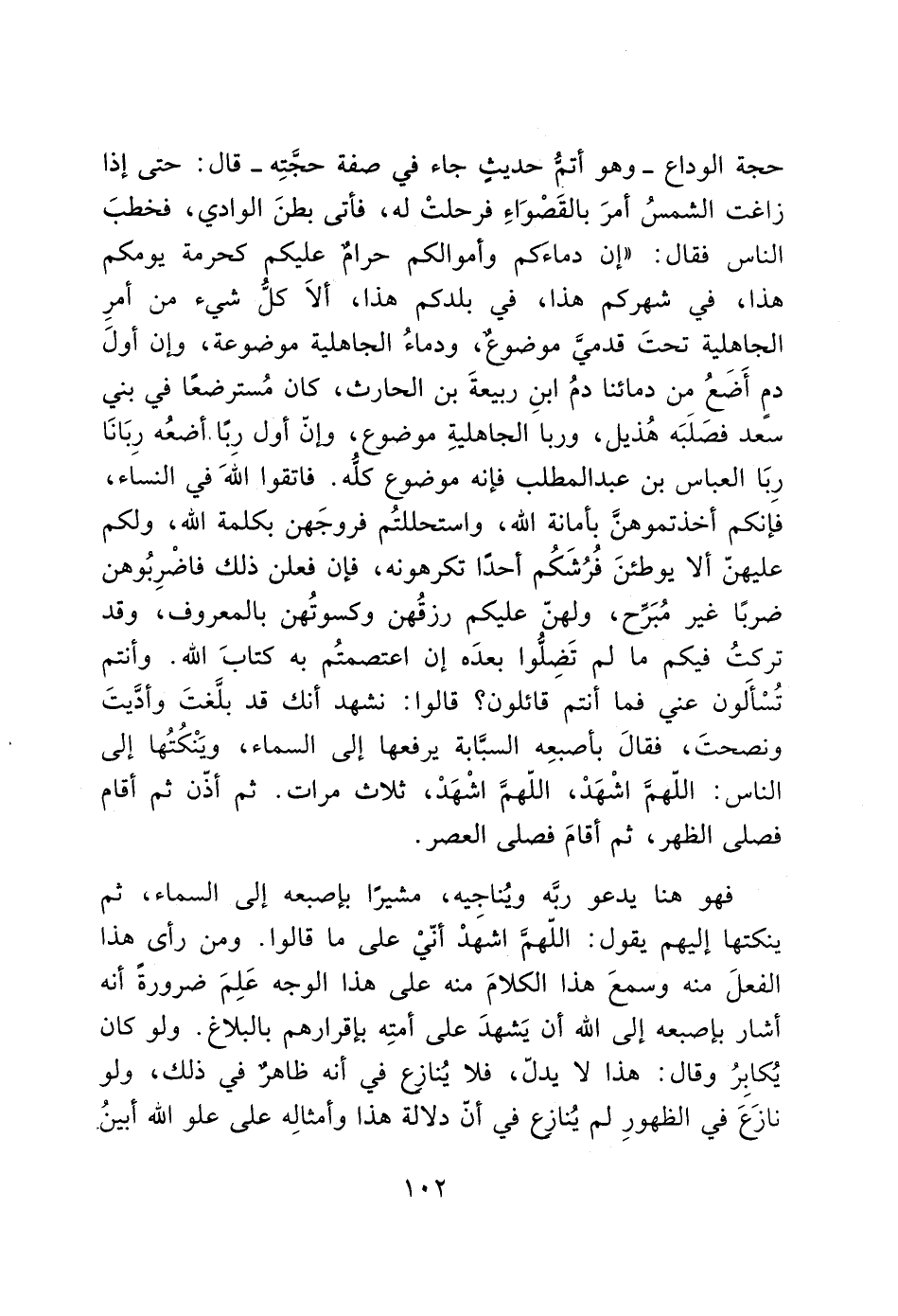 حجة الوداع - وهو أتمُّ حديثٍ جاء في صفة حجَّتِه - قال: حتى إذا زاغت الشمسُ أمرَ بالقَصوَاءِ فرحلتْ له، فأتى بطنَ الوادي، فخطبَ الناس فقال: "إن دماءكم وأموالكم حرام عليكم كحرمة يومكم هذا، في شهركم هذا، في بلدكم هذا، ألاَ كلُّ شيء من أمرِ الجاهلية تحتَ قدميَّ موضوع، ودماءُ الجاهلية موضوعة، وإن أولَ دمٍ أَضَعُ من دمائنا دمُ ابنِ ربيعةَ بن الحارث، كان مُسترضعًا في بني سعد فصَلَبَه هُذيل، وربا الجاهليةِ موضوع، وإن أول رِبًا أضعُه رِبَانَا رِبَا العباس بن عبد المطلب فإنه موضوع كلُّه. فاتقوا الله في النساء، فإنكم أخذتموهنَ بأمانة الله، واستحللتُم فروجَهن بكلمة الله، ولكم عليهنّ ألا يوطئنَ فُرُشَكُم أحدًا تكرهونه، فإن فعلن ذلك فاضْرِبُوهن ضربًا غير مُبَرِّح، ولهن عليكم رزقُهن وكسوتُهن بالمعروف، وقد تركتُ فيكم ما لم تَضِلُّوا بعدَه إن اعتصمتُم به كتابَ الله. وأنتم تُسْأَلون عني فما أنتم قائلون؟ قالوا: نشهد أنك قد بلَّغتَ وأدَّيتَ ونصحتَ، فقالَ بأصبعِه السبَّابة يرفعها إلى السماء، ويَنْكُتُها إلى الناس: اللهمَّ اشْهَدْ، اللهمَّ اشْهَدْ، ثلاث مرات. ثم أذّن ثم أقام فصلى الظهر، ثم أقامَ فصلى العصر.