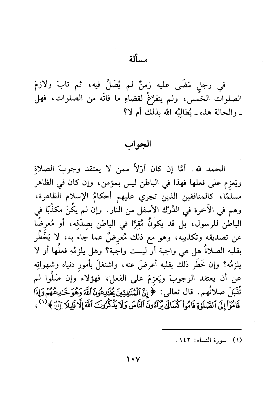 الحمد لله. أمَّا إن كان أوّلاً ممن لا يعتقد وجوبَ الصلاةِ ويَعزِم على فعلها فهذا في الباطن ليس بمؤمن، وإن كان في الظاهر مسلمًا، كالمنافقين الذين تجري عليهم أحكامُ الإسلام الظاهرة، وهم في الآخرة في الدَّرْك الأسفل من النار. وإن لم يكُنْ مكذِّبًا في الباطن للرسول، بل قد يكونُ مُقِرًّا في الباطن بصِدْقِه، أو مُعرِضًا عن تصديقه وتكذيبه، وهو مع ذلك مُعرِضٌ عما جاء به، لا يَخْطُر بقلبه الصلاةُ هل هي واجبة أو ليست واجبة؟ وهل يلزمُه فعلُها أو لا يلزمُه؟ وإن خَطَر ذلك بقلبه أعرضَ عنه، واشتغلَ بأمورِ دنياه وشهواتِه عن أن يعتقد الوجوبَ ويَعزِمَ على الفعل، فهؤلاء وإن صَلَّوا لم تُقْبَلْ صلاتُهم. قال تعالى: (إِنَّ الْمُنَافِقِينَ يُخَادِعُونَ اللَّهَ وَهُوَ خَادِعُهُمْ وَإِذَا قَامُوا إِلَى الصَّلاةِ قَامُوا كُسَالَى يُرَاؤُونَ النَّاسَ وَلا يَذْكُرُونَ اللَّهَ إِلَّا قَلِيلاً (142)) (1)،