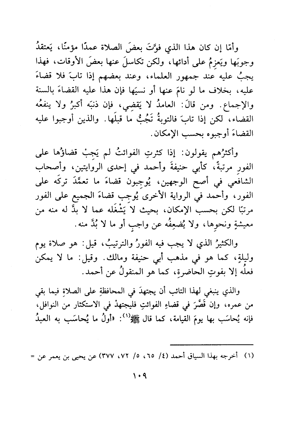وأكثرُهم يقولون: إذا كثرتِ الفوائتُ لم يَجبْ قضاؤُها على الفورِ مرتبةً، كأبي حنيفةَ وأحمد في إحدى الروَايتين، وأصحاب الشافعي في أصح الوجهين، يُوجِبون قضاءَ ما تعمَّدَ تركَه على الفور، وأحمد في الرواية الأخرى يُوجب قضاءَ الجميع على الفور مرتبًا لكن بحسب الإمكان، بحيث لاَ يَشْغَله عما لا بدَّ له منه من معيشةٍ ونحوِها، ولا يُضعِفُه عن واجبٍ أو ما لا بُدَّ منه.