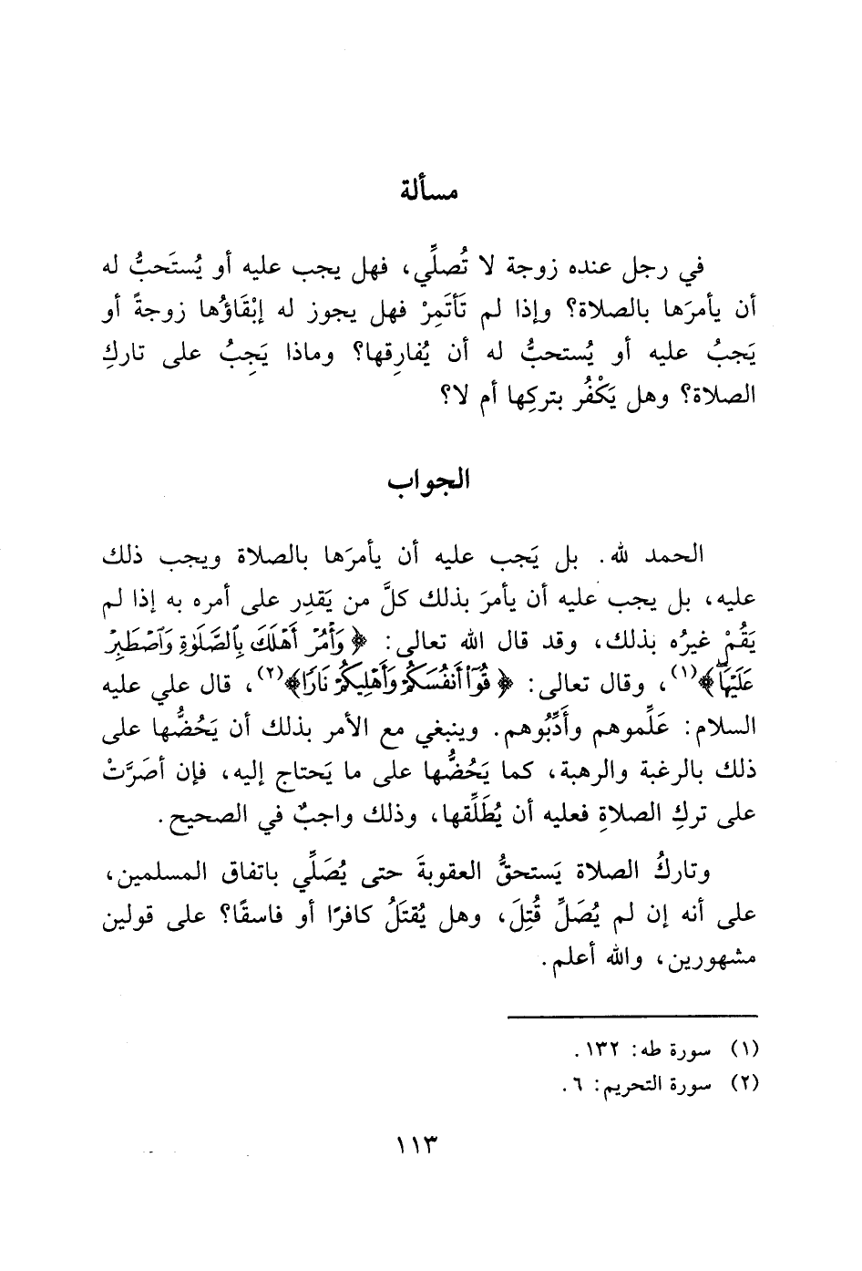 في رجل عنده زوجة لا تُصلِّي، فهل يجب عليه أو يُستَحبُّ له أن يأمرَها بالصلاة؟ وإذا لم تَأتَمِرْ فهل يجوز له إبْقَاؤُها زوجةً أو يَجبُ عليه أو يُستحبُّ له أن يُفارِقها؟ وماذا يَجبُ على تاركِ الصلاة؟ وهل يَكْفُر بتركِها أم لا؟
