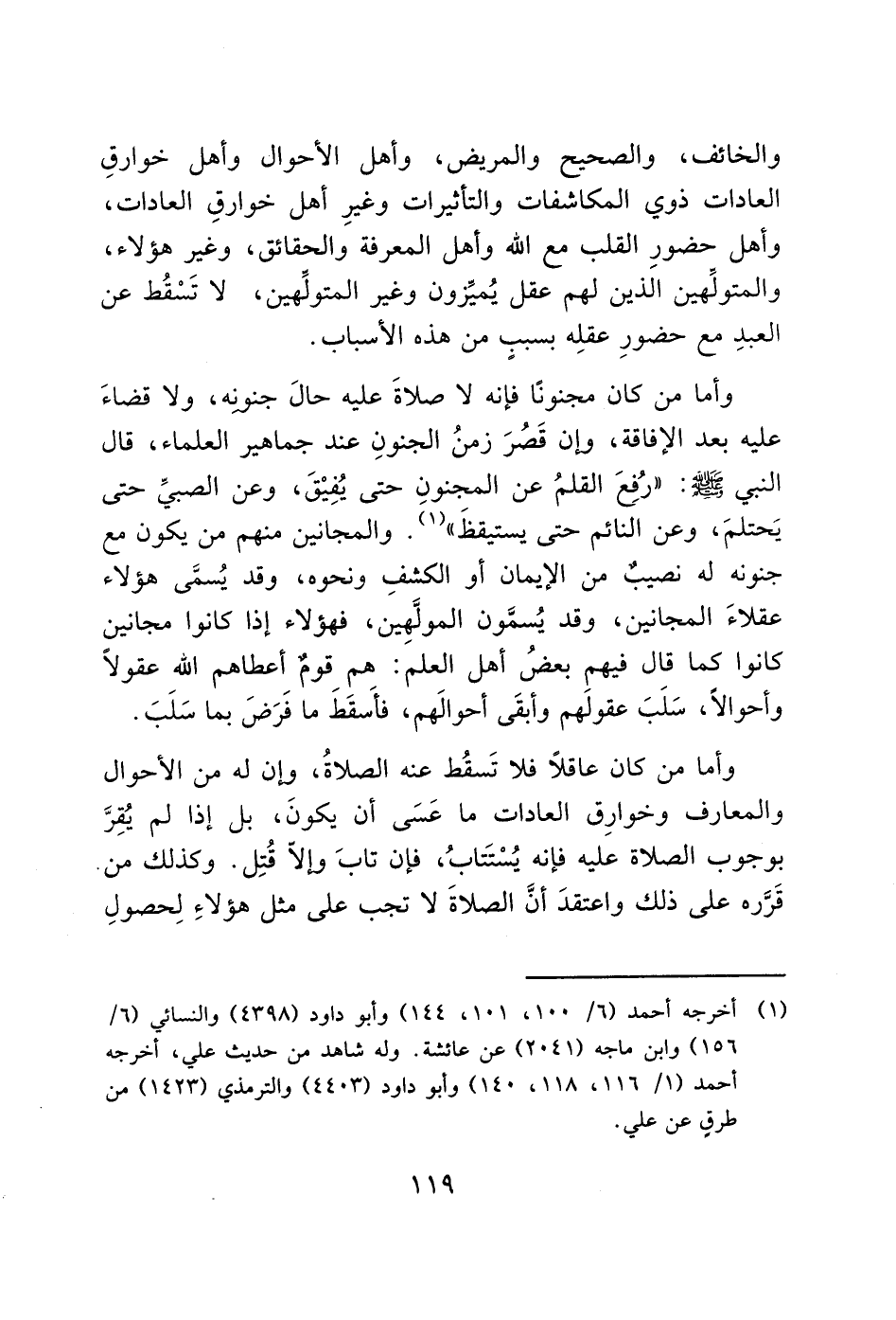 وأما من كان مجنونًا فإنه لا صلاةَ عليه حالَ جنونه، ولا قضاءَ عليه بعد الإفاقة، وإن قَصُرَ زمنُ الجنونِ عند جماهير العلماء، قال النبي - صَلَّى اللَّهُ عَلَيْهِ وَسَلَّمَ -: "رُفِعَ القلمُ عن المجنونِ حتى يُفِيْقَ، وعن الصبيِّ حتى يَحتلمَ، وعن النائم حتى يستيقظَ" (1). والمجانين منهم من يكون مع جنونه له نصيبٌ من الإيمان أو الكشف ونحوه، وقد يُسمَّى هؤلاء عقلاءَ المجانين، وقد يُسمَّون المولَّهِين، فهؤلاء إذا كانوا مجانين كانوا كما قال فيهم بعض أهل العلم: هم قومٌ أعطاهم الله عقولاً وأحوالاً، سَلَبَ عقولَهم وأبقَى أحوالَهم، فأسَقَطَ ما فَرَضَ بما سَلَبَ.