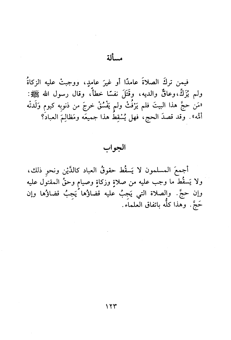 فيمن تركَ الصلاةَ عامدًا أو غيرَ عامدٍ، ووجبتْ عليه الزكاةُ ولم يُزَك، وعاق والديه، وقَتَلَ نفسًا خطأ، وقال رسول الله - صَلَّى اللَّهُ عَلَيْهِ وَسَلَّمَ -: "مَن حج هذا البيتَ فلم يَرْفُثْ ولم يَفْسُقْ خرجَ من ذنوبِه كيومِ وَلَدتْه أمُّه". وقد قصدَ الحج، فهل يُسْقِط هذا جميعَه ومَظالِمَ العباد؟