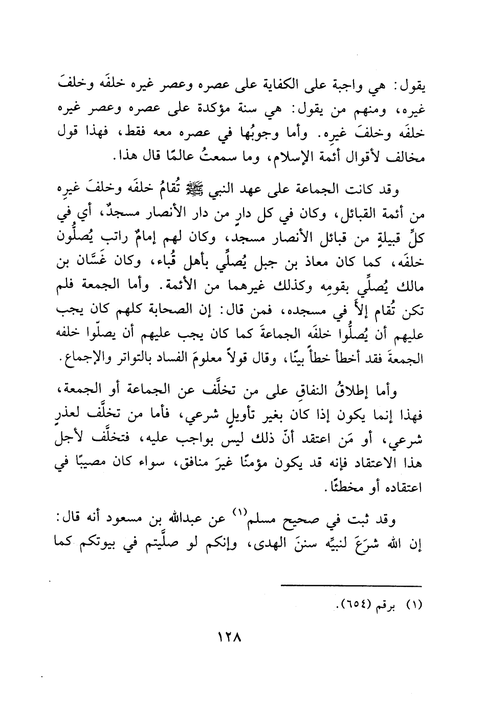 وقد كانت الجماعة على عهد النبي - صَلَّى اللَّهُ عَلَيْهِ وَسَلَّمَ - تُقامُ خلفَه وخلفَ غيرِه من أئمة القبائل، وكان في كل دارٍ من دار الأنصار مسجد، أي في كلِّ قبيلةٍ من قبائل الأنصار مسجد، وكان لهم إمام راتب يُصلُّون خلفَه، كما كان معاذ بن جبل يُصلي بأهل قُباء، وكان غَسان بن مالك يُصلِّي بقومِه وكذلك غيرهما من الأئمة. وأما الجمعة فلم تكن تُقام إلا في مسجده، فمن قال: إن الصحابة كلهم كان يجب عليهم أن يُصلوا خلفَه الجماعةَ كما كان يجب عليهم أن يصلّوا خلفه الجمعةَ فقد أخطأ خطأً بينًا، وقال قولاً معلومَ الفساد بالتواتر والإجماع.