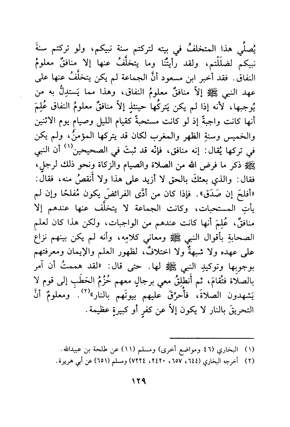 يُصلِّي هذا المتخلفُ في بيته لتركتم سنة نبيكم، ولو تركتم سنةَ نبيكم لضلَلْتم، ولقد رأيتنا وما يتخلَّفُ عنها إلاّ منافقٌ معلومُ النفاق. فقد أخبر ابن مسعود أنَّ الجماعة لم يكن يتخلَّفُ عنها على عهد النبي - صَلَّى اللَّهُ عَلَيْهِ وَسَلَّمَ - إلاّ منافق معلومُ النفاق، وهذا مما يَستدِلُّ به من يُوجبها، لأنه إذا لم يكن يَتركُها حينئذٍ إلاّ منافق معلومُ النفاق عُلِمَ أنها كانت واجبةً إذ لو كانت مستحبةً كقيام الليل وصيام يوم الاثنين والخميس وسنةِ الظهر والمغرب لكان قد يتركها المؤمن، ولم يكن في تركها يُقال: إنه منافق، فإنه قد ثبتَ في الصحيحين (1) أن النبي - صَلَّى اللَّهُ عَلَيْهِ وَسَلَّمَ - ذكر ما فرض الله من الصلاة والصيام والزكاة ونحو ذلك لرجلٍ، فقال: والذي بعثكَ بالحق لا أزيد على هذا ولا أَنقصُ منه، فقال: "أفلحَ إن صَدَق". فإذا كان من أدَّى الفرائضَ يكون مُفلحًا وإن لم يأتِ المستحبات، وكانت الجماعة لا يتخلَّف عنها عندهم إلا منافقٌ، عُلِمَ أنها كانت عندهم من الواجبات، ولكن هذا كان لعلمِ الصحابةِ بأقوال النبي - صَلَّى اللَّهُ عَلَيْهِ وَسَلَّمَ - ومعاني كلامِه، وأنه لم يكن بينهم نزاع على عهده ولا شبهة ولا اختلاف، لظهور العلم والإيمان ومعرفتهم بوجوبِها وتوكيدِ النبي - صَلَّى اللَّهُ عَلَيْهِ وَسَلَّمَ - لها. حتى قال: "لقد هممتُ أن آمر بالصلاة فتُقامَ، ثم أَنطلِقُ معي برجالٍ معهم حُزُمُ الحَطَب إلى قوم لا يَشهدون الصلاةَ، فأحُرِّقَ عليهم بيوتَهم بالنار" (2).َ ومعلومٌ أنَّ التحريقَ بالنار لا يكون إلاّ عن كفرٍ أو كبيرةٍ عظيمة.