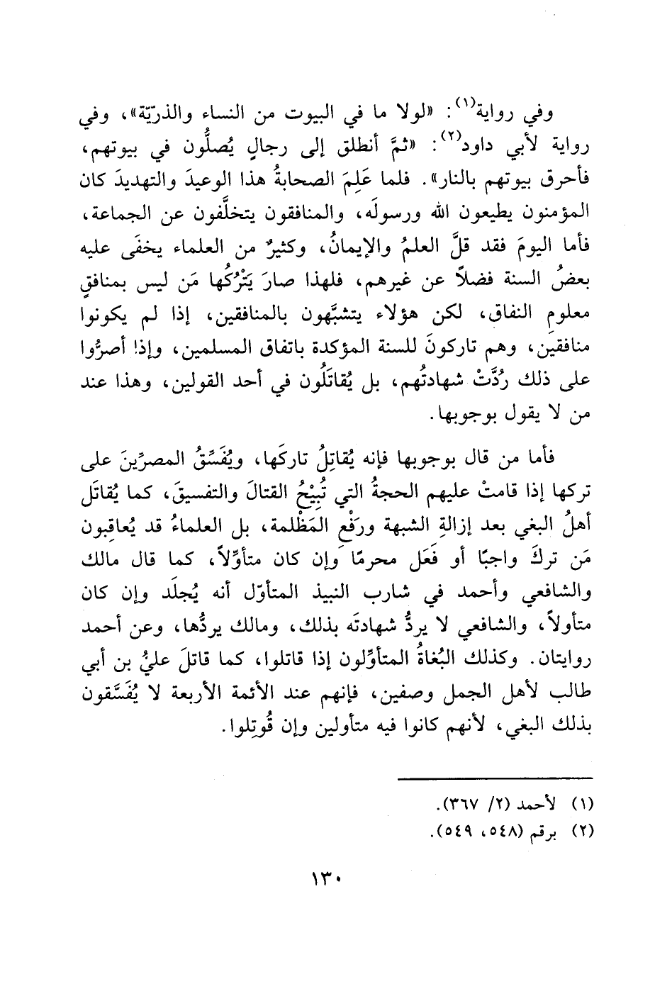 وفي رواية (1): "لولا ما في البيوت من النساء والذزيّة"، وفي رواية لأبي داود (2): "ثم أنطلق إلى رجالي يُصلُّون في بيوتهم، فأحرق بيوتهم بالنار". فلما عَلِمَ الصحابةُ هذا الوعيدَ والتهديدَ كان المؤمنون يطيعون الله ورسولَه، والمنافقون يتخلفون عن الجماعة، فأما اليومَ فقد قل العلمُ والإيمانُ، وكثير من العلماء يخفَى عليه بعضُ السنة فضلاً عن غيرهم، فلهذا صارَ يَتْرُكُها مَن ليس بمنافق معلومِ النفاق، لكن هؤلاء يتشبهون بالمنافقين، إذا لم يكونوا منافقين، وهم تاركونَ للسنة المؤكدة باتفاق المسلمين، وإذا أصرُّوا على ذلك رُدَّتْ شهادتُهم، بل يُقاتَلُون في أحد القولين، وهذا عند من لا يقول بوجوبها.