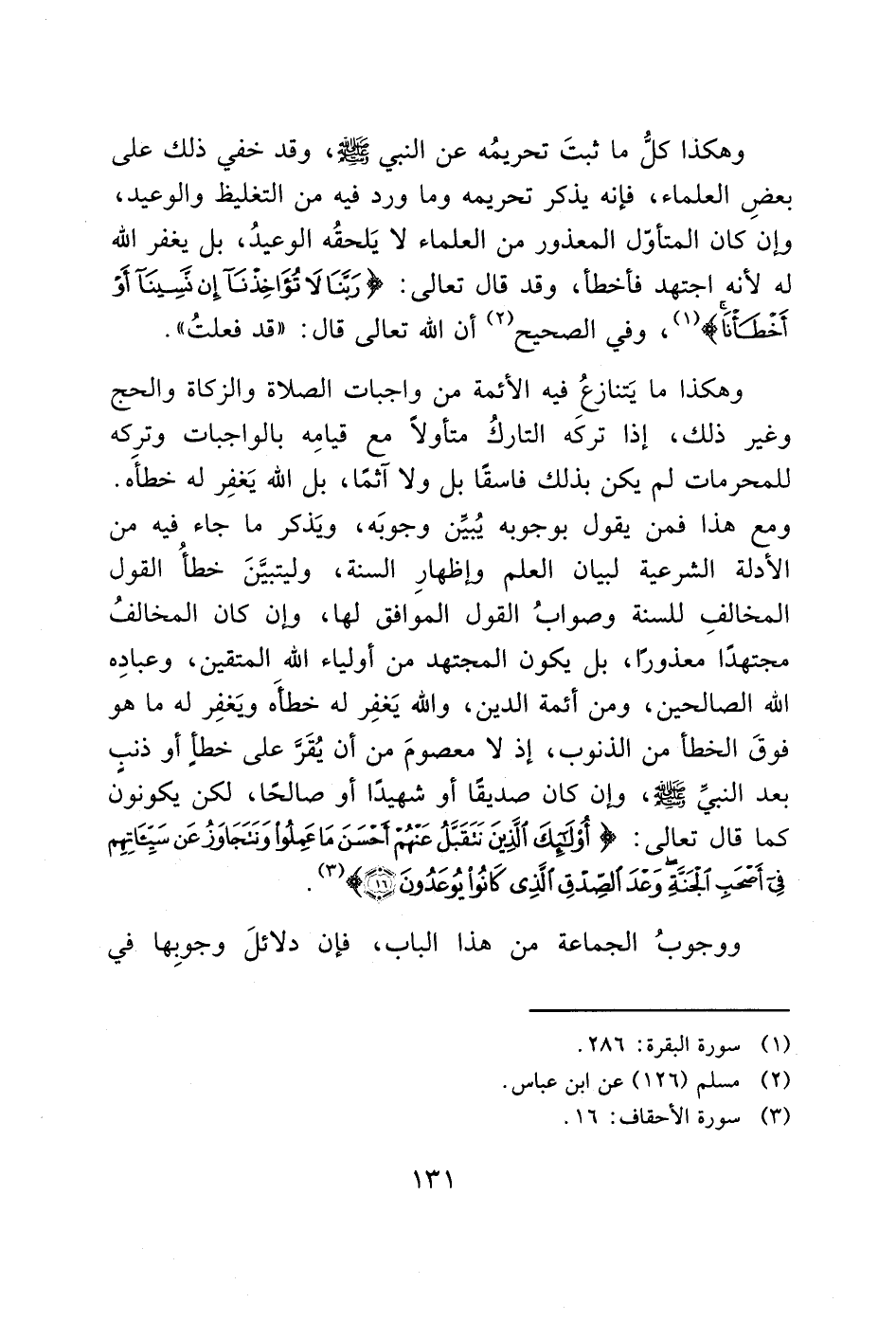 ومع هذا فمن يقول بوجوبه يُبين وجوبَه، ويَذكر ما جاء فيه من الأدلة الشرعية لبيان العلم وإظهارِ السنة، وليتبينَ خطأُ القول المخالفِ للسنة وصوابُ القول الموافق لها، وإن كان المخالفُ مجتهدًا معذورًا، بل يكون المجتهد من أولياء الله المتقين، وعبادِه الله الصالحين، ومن أئمة الدين، والله يَغفِر له خطأه ويَغفِر له ما هو فوقَ الخطأ من الذنوب، إذ لا معصومَ من أن يُقَر على خطأٍ أو ذنبٍ بعد النبي - صَلَّى اللَّهُ عَلَيْهِ وَسَلَّمَ -، وإن كان صديقًا أو شهيدًا أو صالحًا، لكن يكونون كما قال تعالى: (أُولَئِكَ الَّذِينَ نَتَقَبَّلُ عَنْهُمْ أَحْسَنَ مَا عَمِلُوا وَنَتَجاوَزُ عَنْ سَيِّئَاتِهِمْ فِي أَصْحَابِ الْجَنَّةِ وَعْدَ الصِّدْقِ الَّذِي كَانُوا يُوعَدُونَ (16)) (3).