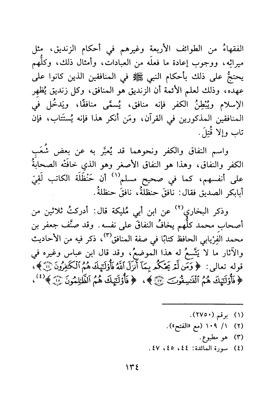 وذكر البخاري (2) عن ابن أبي مُليكة قال: أدركتُ ثلاثين من أصحاب محمد كلُّهم يخافُ النفاقَ على نفسه. وقد صنَّف جعفر بن محمد الفِرْيابي الحافظ كتابًا في صفة المنافق (3)، ذكر فيه من الأحاديث والآثار ما لا يَتسِعُ له هذا الموضعُ، وقد قال ابن عباس وغيره في قوله تعالى: (وَمَنْ لَمْ يَحْكُمْ بِمَا أَنْزَلَ اللَّهُ فَأُولَئِكَ هُمُ الْكَافِرُونَ (44))، (فَأُولَئِكَ هُمُ الْفَاسِقُونَ (47))، (فَأُولَئِكَ هُمُ الظَّالِمُونَ (45)) (4)،