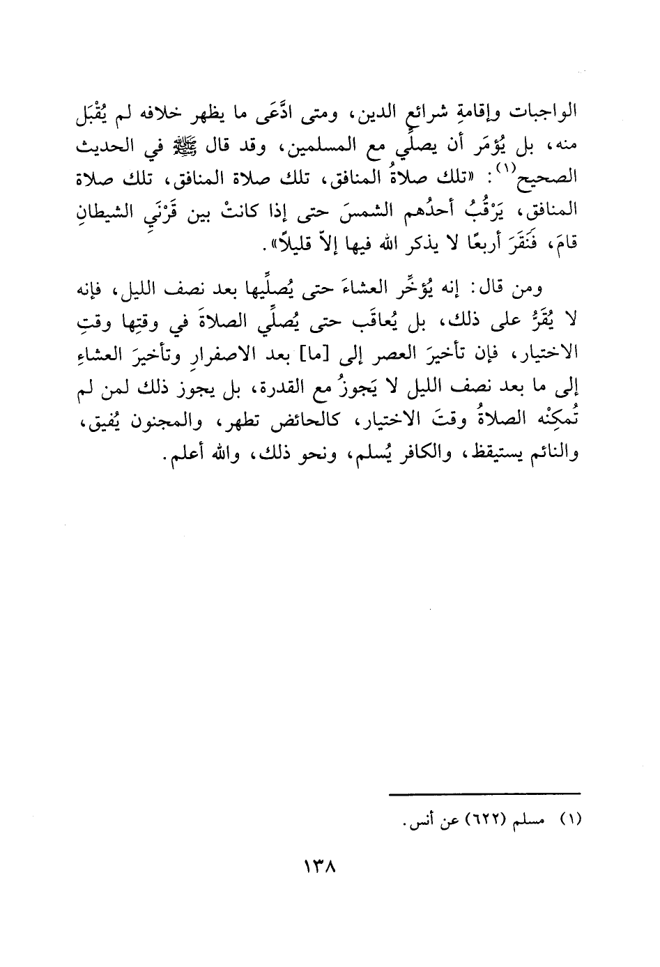 ومن قال: إنه يُؤخر العشاءَ حتى يُصليها بعد نصف الليل، فإنه لا يُقَرُّ على ذلك، بل يُعاقَب حتى يُصلي الصلاةَ في وقتِها وقتِ الاختيار، فإن تأخيرَ العصر إلى [ما] بعد الاصفرارِ وتأخيرَ العشاءِ إلى ما بعد نصف الليل لا يَجوزُ مع القدرة، بل يجوز ذلك لمن لم تُمكِنْه الصلاةُ وقتَ الاختيار، كالحائض تطهر، والمجنون يُفيق، والنائم يستيقظ، والكافر يُسلم، ونحو ذلك، والله أعلم.