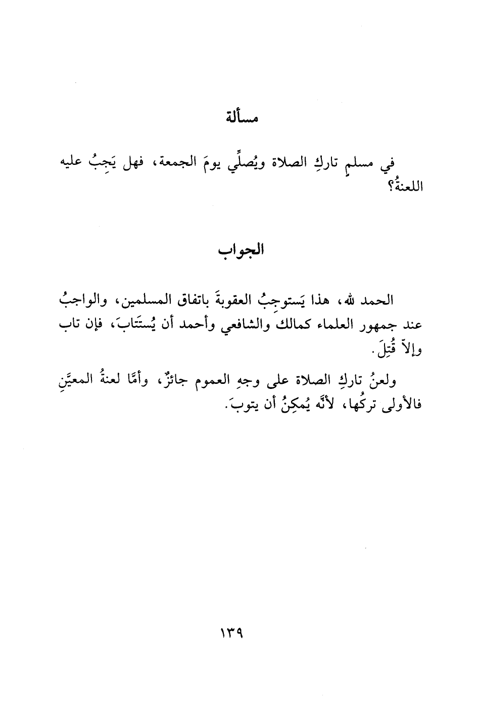 ولعنُ تاركِ الصلاة على وجهِ العموم جائزٌ، وأما لعنةُ المعينِ فالأولى تركُها، لأنه يُمكِنُ أن يتوبَ.