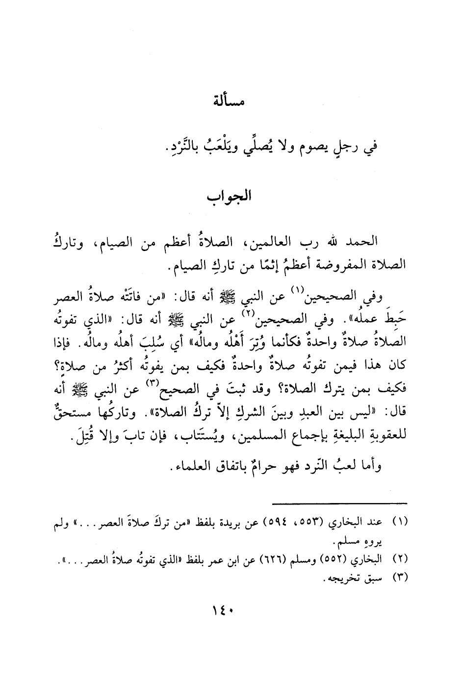 فكيف بمن يترك الصلاة؟ وقد ثبتَ في الصحيح (3) عن النبي - صَلَّى اللَّهُ عَلَيْهِ وَسَلَّمَ - أنه قال: "ليس بين العبدِ وبينَ الشركِ إلاّ تركُ الصلاة". وتاركُها مستحق للعقوبةِ البليغةِ بإجماع المسلمين، ويُستَتاب، فإن تابَ وإلا قُتِلَ. وأما لعبُ النرد فهو حرامٌ باتفاق العلماء.