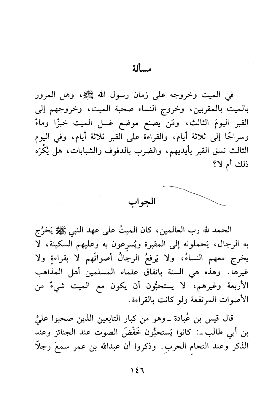 في الميت وخروجه على زمان رسول الله - صَلَّى اللَّهُ عَلَيْهِ وَسَلَّمَ -، وهل المرور بالميت بالمقربين، وخروج النساء صحبة الميت، وخروجهم إلى القبر اليومَ الثالث، ومَن يصنع موضع غسل الميت خبزا وماء وسراجا إلى ثلاثة أيام، والقراءة على القبر ثلاثة أيام، وفي اليوم الثالث نسق القبر بأيديهم، والضرب بالدفوف والشبابات، هل يُكْرَه ذلك أم لا؟