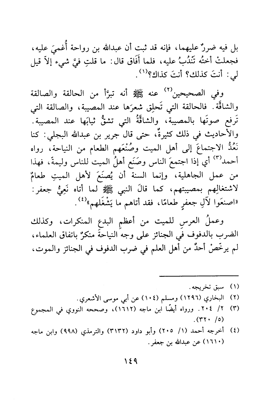 والأحاديث في ذلك كثيرة، حتى قال جرير بن عبد الله البجلي: كنا نَعُدُّ الاجتماعَ إلى أهل الميت وصُنْعَهم الطعام من النياحة، رواه أحمد (3) أي إذا اجتمعَ الناس وصَنَع أهلُ الميت للناس وليمةً، فهذا من عمل الجاهلية، وإنما السنة أن يُصنَعَ لأهل الميتِ طعامٌ لاشتغالِهم بمصيبتهم، كما قالَ النبي - صَلَّى اللَّهُ عَلَيْهِ وَسَلَّمَ - لما أتاه نَعِيُّ جعفر: "اصنعَوا لآلِ جعفر طعامًا، فقد أتاهم ما يَشْغَلهم" (4).