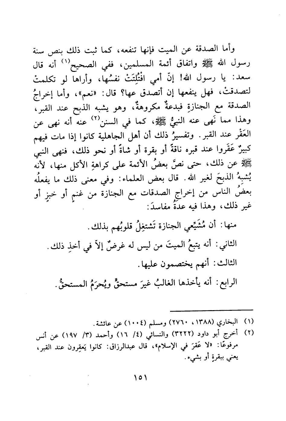 وأما الصدقة عن الميت فإنها تنفعه، كما ثبت ذلك بنص سنة رسول الله - صَلَّى اللَّهُ عَلَيْهِ وَسَلَّمَ - واتفاق أئمة المسلمين، ففي الصحيح (1) أنه قال سعد: يا رسول الله! إنّ أمي افْتُلِتَتْ نفسُها، وأراها لو تكلمتْ لتصدقتْ، فهل ينفعها إن أتصدق عنها؟ قال: "نعم"، وأما إخراجُ الصدقة مع الجنازةِ فبدعة مكروهةٌ، وهو يشبه الذبح عند القبر، وهذا مما نَهى عنه النبي - صَلَّى اللَّهُ عَلَيْهِ وَسَلَّمَ -، كما في السنن (2) عنه أنه نهى عن العَقْر عند القبر. وتفسيرُ ذلك أن أهل الجاهلية كانوا إذا مات فيهم كبيرٌ عَقَروا عند قبره ناقة أو بقرة أو شاة أو نحو ذلك، فنهى النبي - صَلَّى اللَّهُ عَلَيْهِ وَسَلَّمَ - عن ذلك، حتى نص بعضُ الأئمة على كراهةِ الأكل منها، لأنه يُشبهُ الذبحَ لغير الله. قال بعض العلماء: وفي معنى ذلك ما يفعلُه بعضُ الناس من إخراجِ الصدقات مع الجنازة من غنم أو خبز أو غير ذلك، وهذا فيه عدةُ مفاسدَ:
