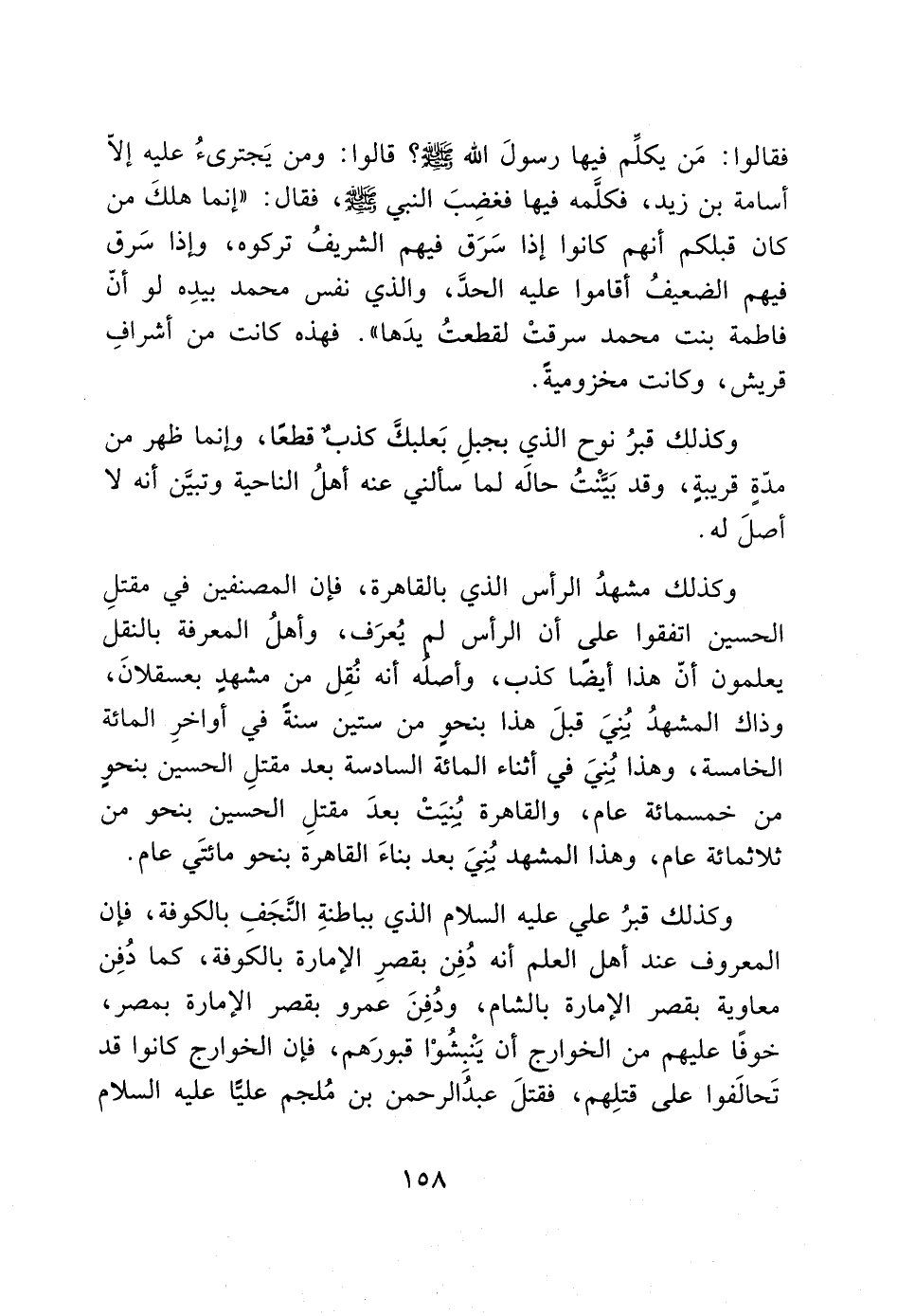 وكذلك قبرُ علي عليه السلام الذي بباطنةِ النَّجَفِ بالكوفة، فإن المعروف عند أهل العلم أنه دُفِن بقصرِ الإمارة بالكوفة، كما دُفِن معاوية بقصر الإمارة بالشام، ودُفِنَ عمرو بقصر الإمارة بمصر، خوفًا عليهم من الخوارج أن يَنْبشوْا قبورَهم، فإن الخوارج كانوا قد تَحالَفوا على قتلِهم، فقتلَ عبدُ الرحمن بن مُلجم عليًّا عليه السلام
