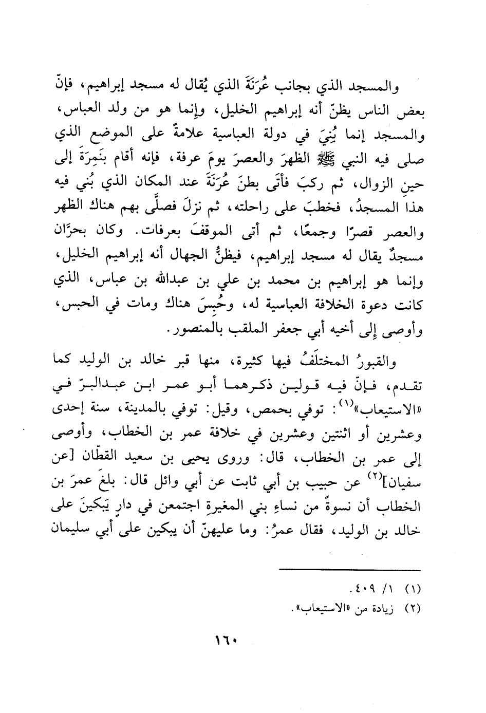 والمسجد الذي بجانب عُرَنَةَ الذي يُقال له مسجد إبراهيم، فإنّ بعض الناس يظن أنه إبراهيم الخليل، وإِنما هو من ولد العباس، والمسجد إنما بنيَ في دولة العباسية علامةً على الموضع الذي صلى فيه النبي - صَلَّى اللَّهُ عَلَيْهِ وَسَلَّمَ - الظهرَ والعصرَ يومَ عرفة، فإنه أقام بنَمِرَةَ إلى حينِ الزوال، ثم ركبَ فأتَى بطنَ عُرَنَةَ عند المكان الذي بُني فيه هذا المسجدُ، فخطبَ على راحلته، ثم نزلَ فصلَّى بهم هناك الظهر والعصر قصرًا وجمعًا، ثم أتى الموقفَ بعرفات. وكان بحرَّان مسجدٌ يقال له مسجد إبراهيم، فيظنُّ الجهال أنه إبراهيم الخليل، وإنما هو إبراهيم بن محمد بن علي بن عبد الله بن عباس، الذي كانت دعوة الخلافة العباسية له، وحُبسَ هناك ومات في الحبس، وأوصى إِلى أخيه أبي جعفر الملقب بالَمنصور.