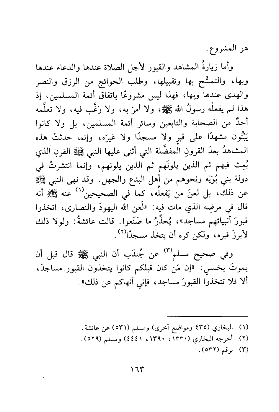 وفي صحيح مسلم (3) عن جُندَب أن النبي - صَلَّى اللَّهُ عَلَيْهِ وَسَلَّمَ - قال قبل أن يموتَ بخمس: "إن مَن كان قبلكم كانوا يتخذون القبور مساجدَ، إلاّ فلا تتخذوا القبورَ مساجد، فإني أنهاكم عن ذلك".