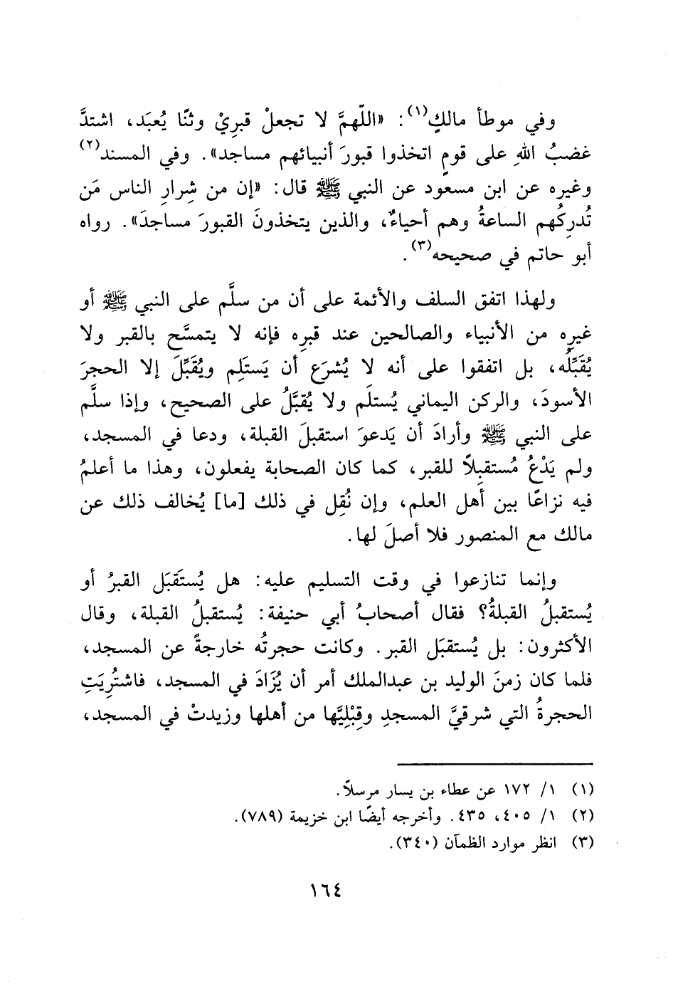 وفي موطأ مالك (1): "اللهمَّ لا تجعلْ قبرِيْ وثنا يُعبَد، اشتدَّ غضبُ الله على قوم اتخذوا قبورَ أنبيائهم مساجد". وفي المسند (2) وغيره عن ابن مسعود عن النبي - صَلَّى اللَّهُ عَلَيْهِ وَسَلَّمَ - قال: "إن من شِرارِ الناس مَن تُدرِكُهم الساعةُ وهم أحياءٌ، والذين يتخذونَ القبورَ مساجدَ". رواه أبو حاتم في صحيحه (3).