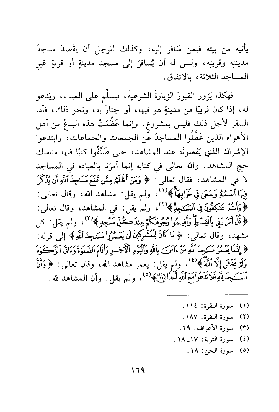 فهكذا يَزور القبورَ الزيارةَ الشرعيةَ، فيسلِّم على الميت، ويَدعو له، إذا كان قريبًا من مدينةٍ هو فيها، أو اجتازَ به، ونحو ذلك، فأما السفر لأجل ذلك فليس بمشروع. وإنما عَظُمَتْ هذه البدعُ من أهل الأهواء الذين عَطَّلُوا المساجدَ عًن الجمعات والجماعات، وابتدعوا الإشراك الذي يَفعلونَه عند المشاهد، حتى صَنَّفُوا كتبًا فيها مناسك حج المشاهد. والله تعالى في كتابه إنما أمرَنا بالعبادة في المساجد لا في المشاهد، فقال تعالى: (وَمَنْ أَظْلَمُ مِمَّنْ مَنَعَ مَسَاجِدَ اللَّهِ أَنْ يُذْكَرَ فِيهَا اسْمُهُ وَسَعَى فِي خَرَابِهَا) (1)، ولم يقل: مشاهد الله، وقال تعالى: (وَأَنْتُمْ عَاكِفُونَ فِي الْمَسَاجِدِ) (2)، ولم يقل: في المشاهد، وقال تعالى: (قُلْ أَمَرَ رَبِّي بِالْقِسْطِ وَأَقِيمُوا وُجُوهَكُمْ عِنْدَ كُلِّ مَسْجِدٍ) (3)، ولم يقل: كل مشهد، وقال تعالى: (مَا كَانَ لِلْمُشْرِكِينَ أَنْ يَعْمُرُوا مَسَاجِدَ اللَّهِ) إلى قوله: (إِنَّمَا يَعْمُرُ مَسَاجِدَ اللَّهِ مَنْ آَمَنَ بِاللَّهِ وَالْيَوْمِ الْآَخِرِ وَأَقَامَ الصَّلَاةَ وَآَتَى الزَّكَاةَ وَلَمْ يَخْشَ إِلَّا اللَّهَ) (4)، ولم يقل: يعمر مشاهد الله، وقال تعالى: (أَنَّ الْمَسَاجِدَ لِلَّهِ فَلَا تَدْعُوا مَعَ اللَّهِ أَحَدًا (18))، ولم يقل: وأن المشاهد لله.