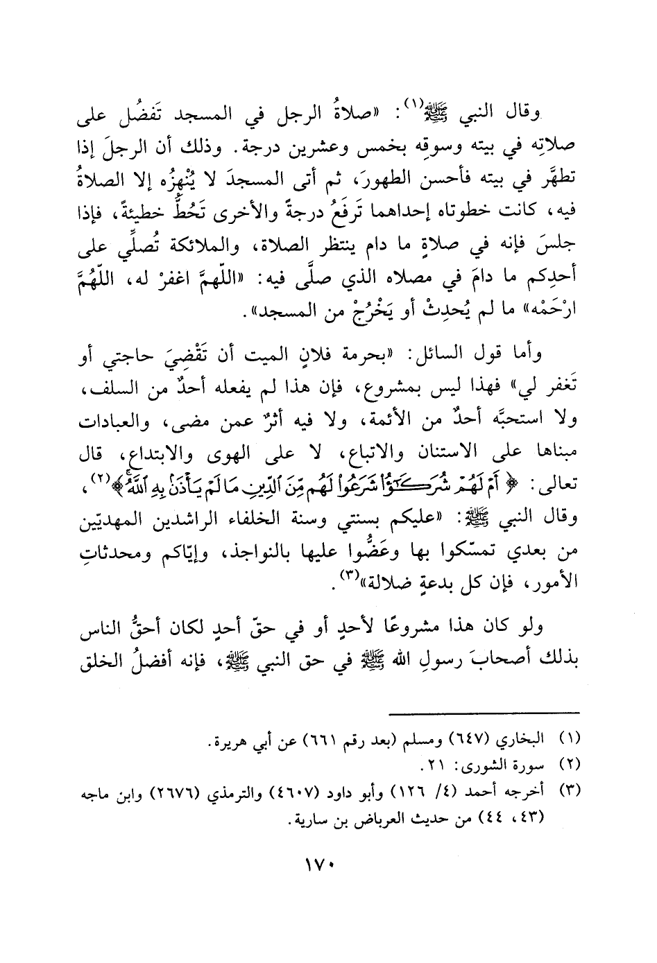 وقال النبي - صَلَّى اللَّهُ عَلَيْهِ وَسَلَّمَ - (1): "صلاة الرجل في المسجد تَفضُل على صلاتِه في بيته وسوقِه بخمس وعشرين درجة. وذلك أن الرجلَ إذا تطهَّر في بيته فأحسن الطهورَ، ثم أتى المسجدَ لا يُنْهزُه إلاّ الصلاةُ فيه، كانت خطوتاه إحداهما تَرفَعُ درجةً والأخرى تَحُطّ خطيئةً، فإذا جلسَ فإنه في صلاةٍ ما دام ينتظر الصلاة، والملائكة تُصفَي على أحدِكم ما دامَ في مصلاه الذي صفَى فيه: "اللهمَّ اغفرْ له، اللهُمَّ ارْحَمْه " ما لم يُحدِثْ أو يَخْرُجْ من المسجد".